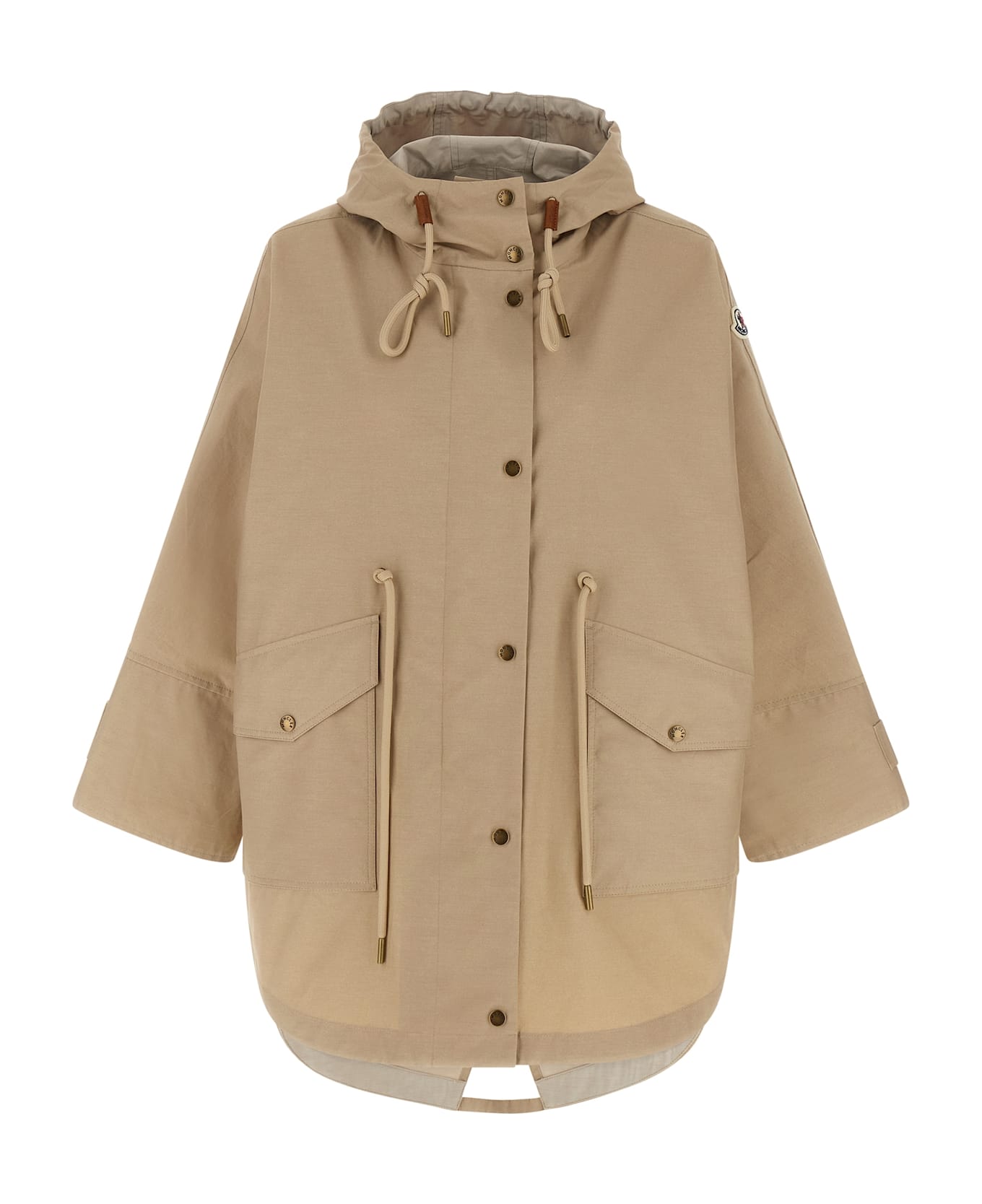 'Brunnera' cotton parka with water repellent treatment, adjustable hood, high neck, zip closure and front snap buttons, long wide bat sleeves with adjustable cuffs and felt logo patch, drawstring at the waist, rounded hem with back cut-out, unlined.
