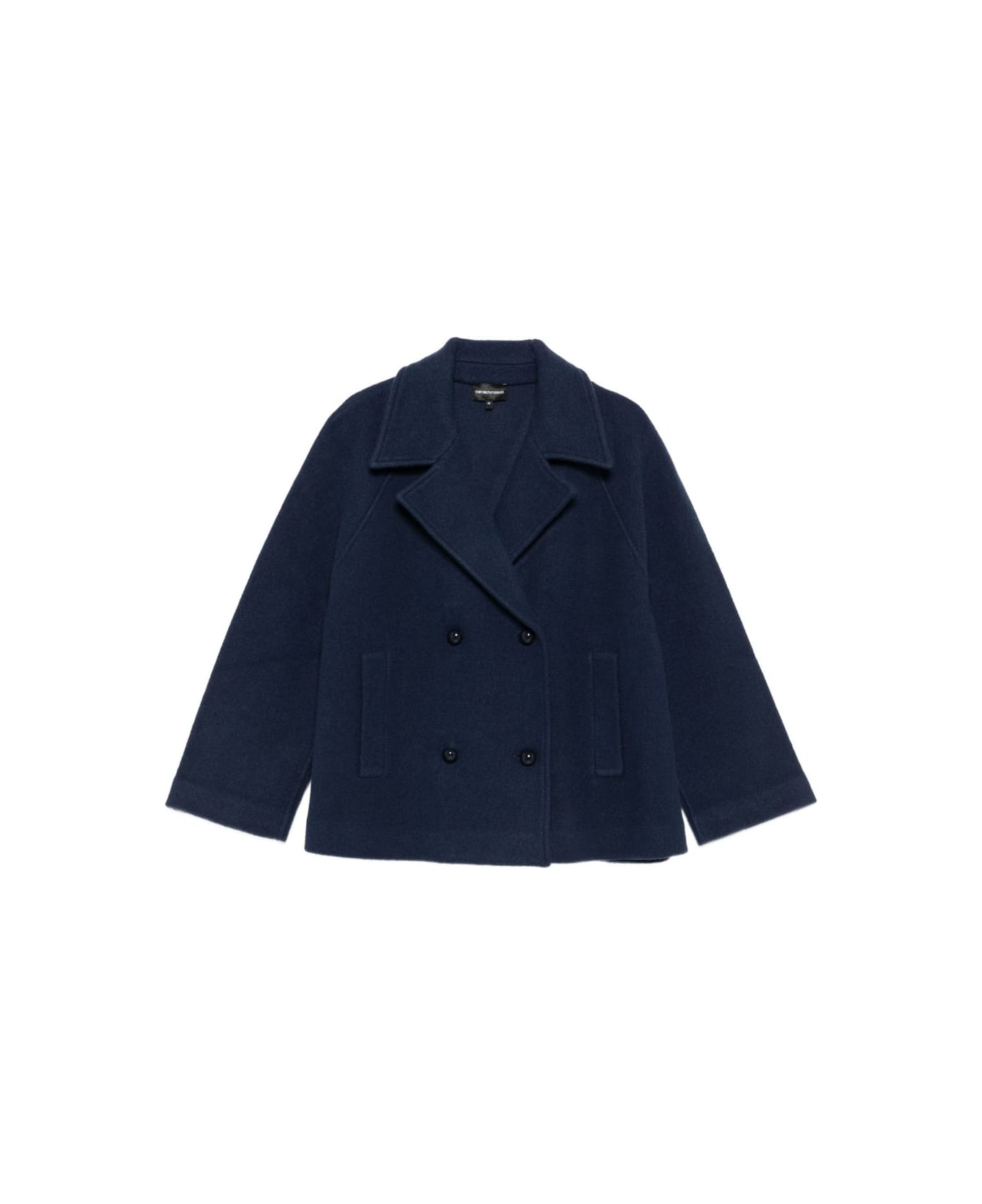 blue wool material double-breasted fastening raglan sleeves patch pockets straight hem Composition: 15% Cotton, 85% Virgin Wool