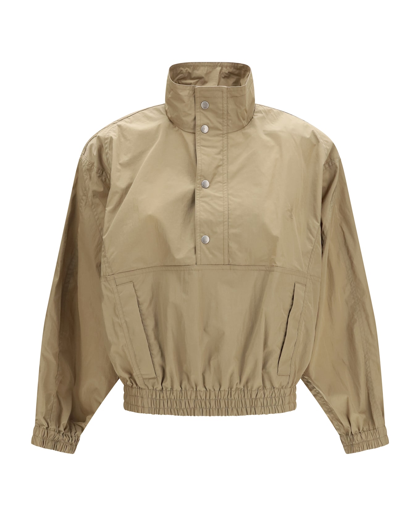 The crinkled-effect windbreaker by saint laurent combines contemporary style with sustainable materials. crafted from recycled polyester, it features a stand collar with a half-button closure. the design includes dropped shoulders, two front welt pockets, and gathered waist and cuffs, creating a relaxed and modern silhouette.
