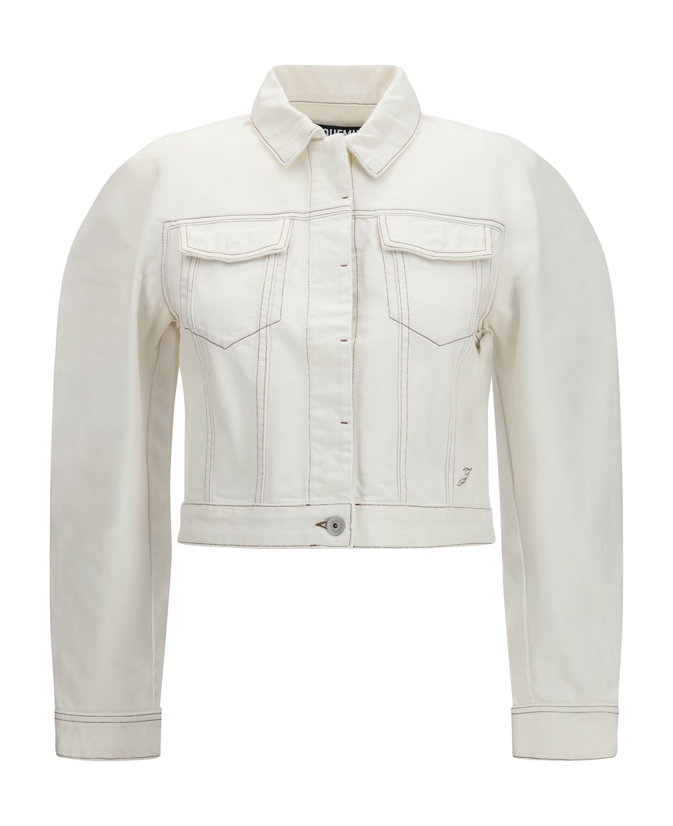 The ovalo jacket in denim by jacquemus is a denim jacket with a curved design, featuring a straight fit that ensures comfort and structure. made from écru denim with tone-on-tone stitching, it features a pointed collar, back yoke, and patch chest pockets that reinterpret classic workwear in a modern way. the rounded sleeves define the garment s distinctive silhouette, while the embroidered j on the side adds an iconic detail. the model is completed with buttoned cuffs, adjustable tabs at the hem, and engraved metal buttons.