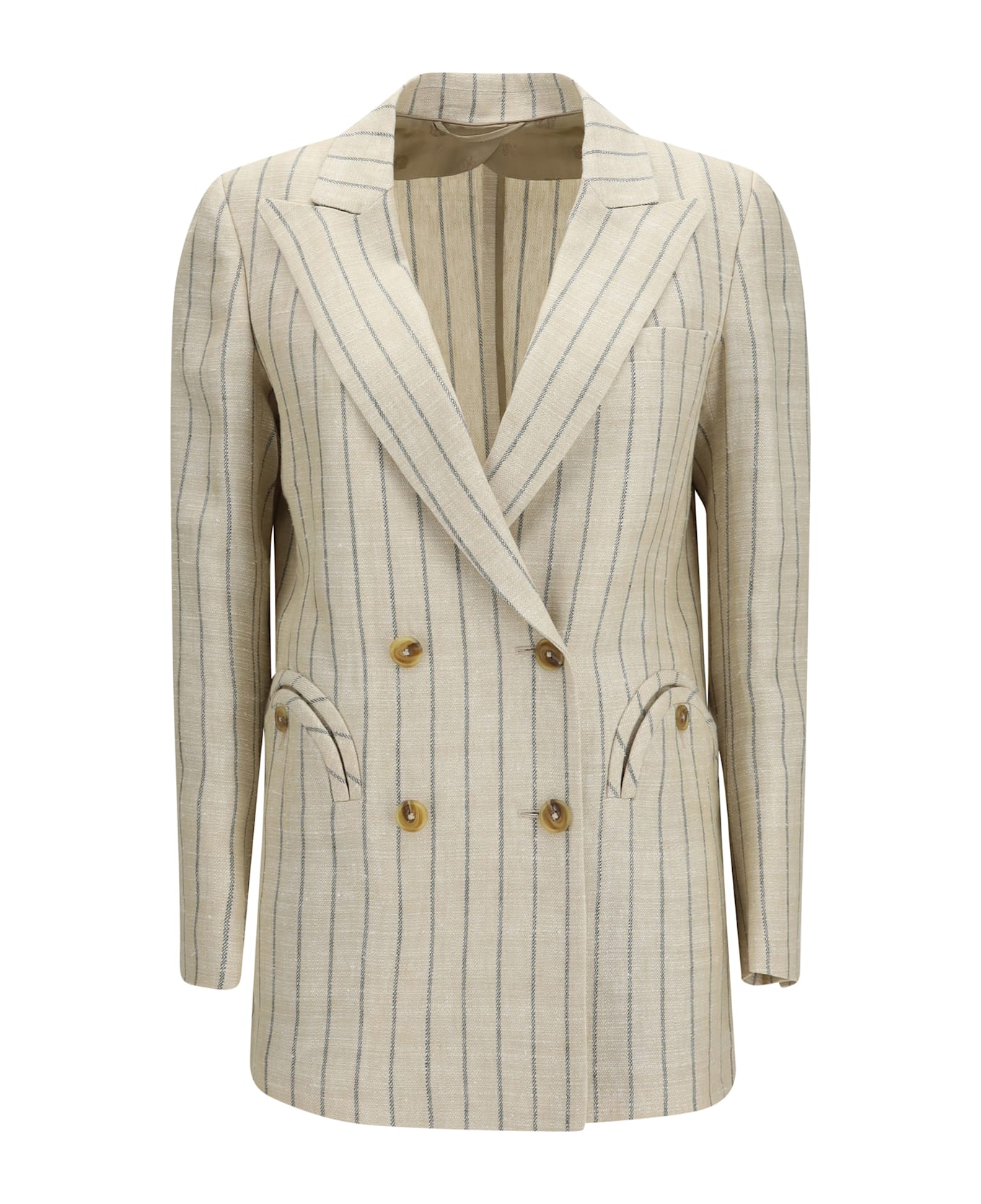 The serene tea pinstripe double-breasted blazer by blazè milano is crafted from a fresh blend of linen, viscose, cotton, and silk, making it ideal for the spring summer season. lightly padded shoulders and peak lapels create a structured and elegant silhouette. iconic rounded pockets, a back vent, and logo tortoiseshell four-hole buttons with a mother-of-pearl internal button complete the garment with distinctive tailoring details.