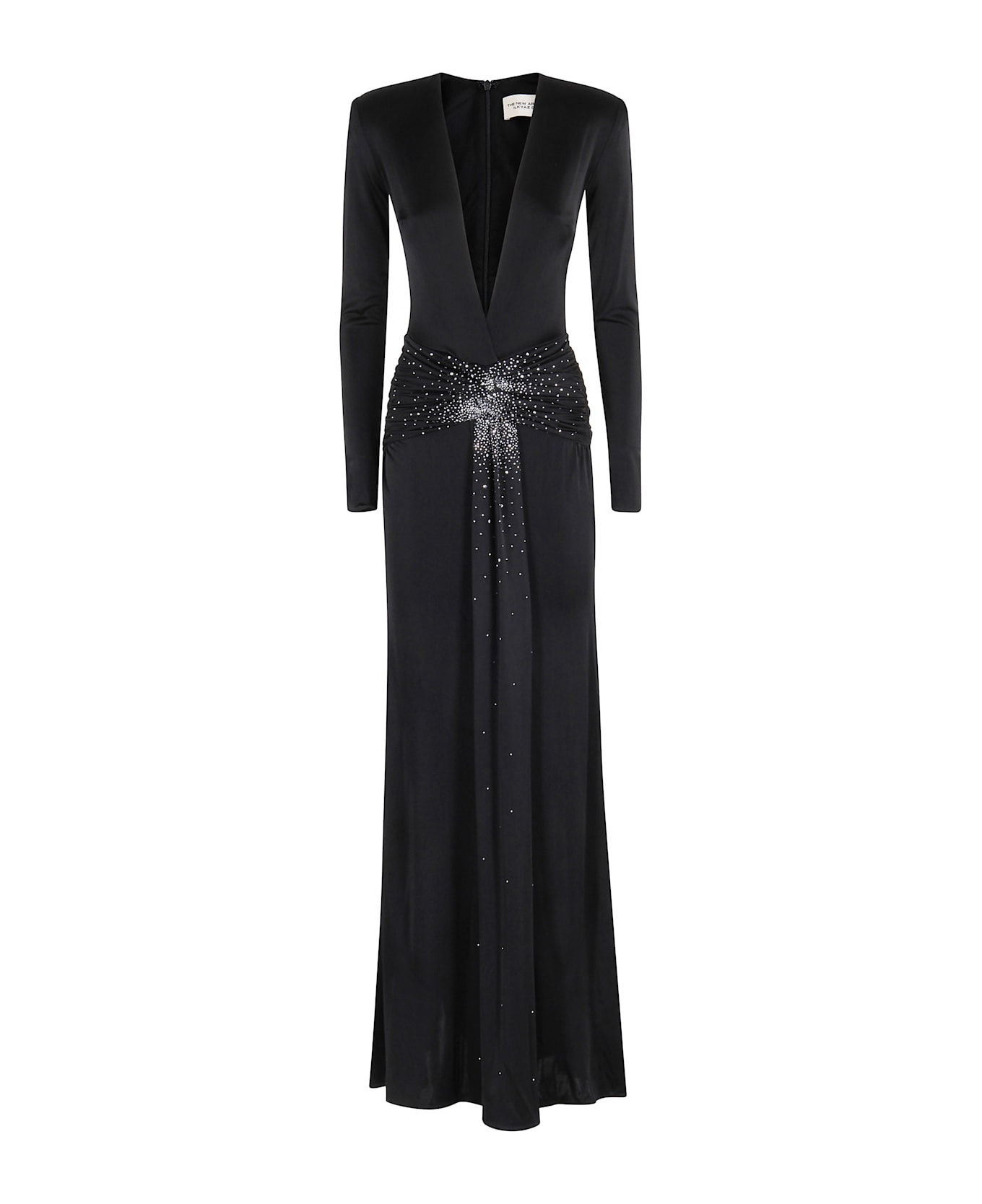 Azure Maxi Dress in Magie - The New Arrivals Ilkyaz Ozel - black color - deep v-neck - back zipper closure - long sleeves - front drape with rhinestones - foot length