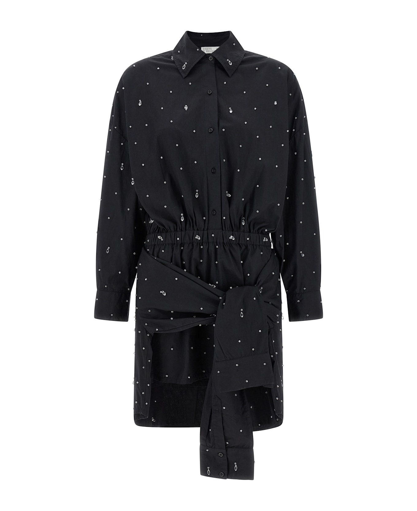 Mini dress in cotton poplin with all-over crystal appliqué, double chemisier model with mirror construction, front button closure, long sleeves with cuffs, elastic waistband, additional sleeves to be tied around the waist or left loose along the sides, asymmetrical hem.