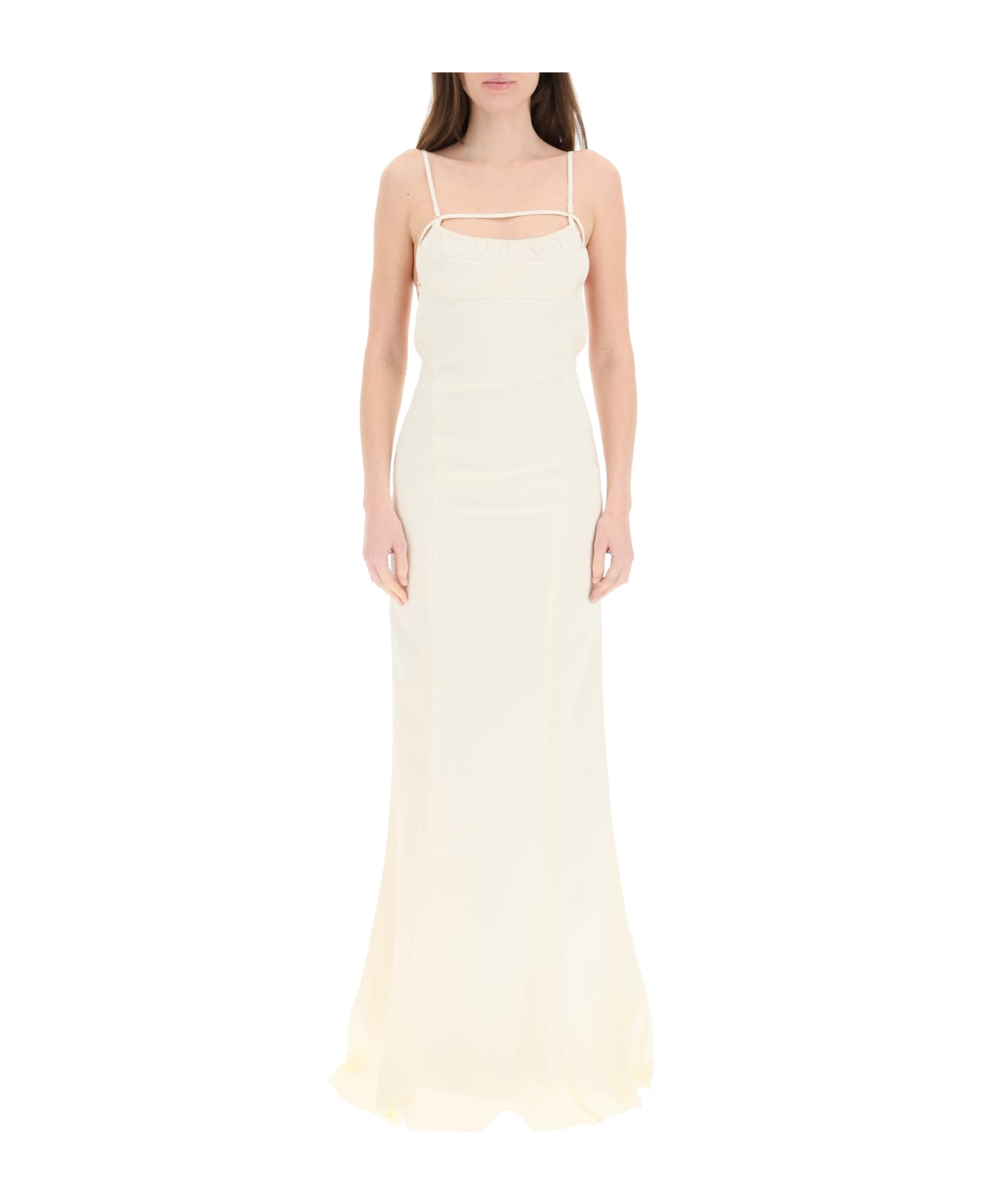 JACQUEMUS long dress made from champagne-colored viscose satin, with a snug silhouette with bare back and flared hem. Straight neckline with thin adjustable bra-style straps. Back invisible zip closure. Lined interior. The model is 177 cm tall and wears a size FR 34. Composition: 100% viscosa