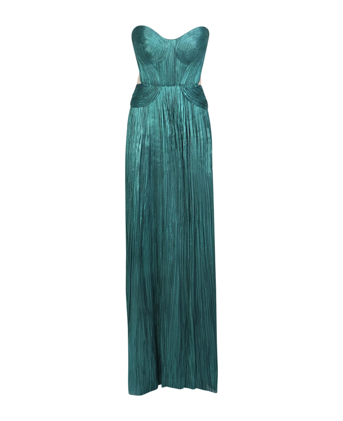 Sweetheart neckline. Sleeveless. Rear lace fastening. Adjustable fastening. Cut out details. Draped panels on bust. Pleated skirt. Transparent mesh panels. Metallic finish. Straight hem. Color: teal