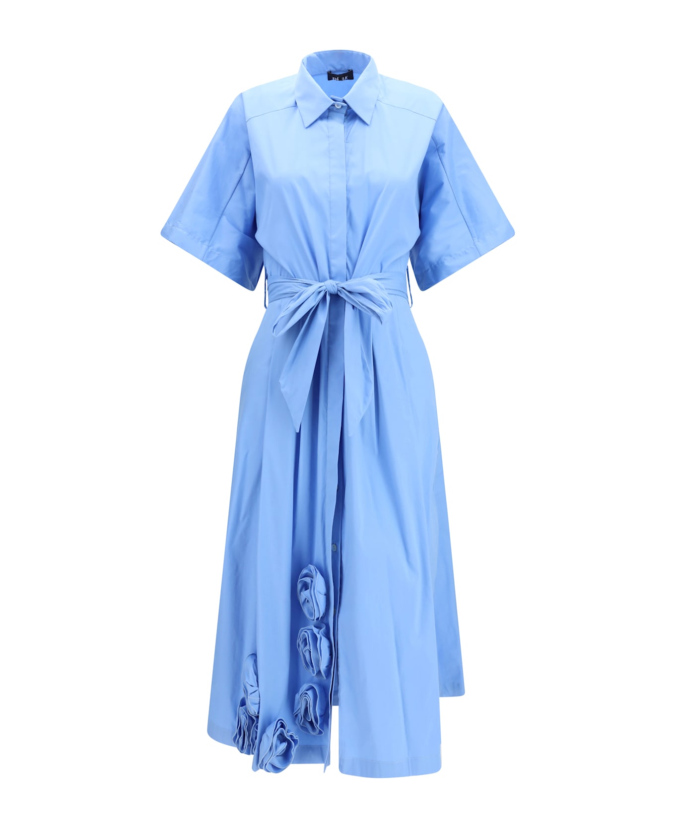 The long chemisier dress by ella is an elegant and minimalist piece, featuring a long, sophisticated silhouette. it has a classic collar, button closure along the entire length, and a waist belt to enhance the figure. the detail of appliqué roses on one side of the skirt adds a refined and distinctive touch, perfect for chic and contemporary looks.