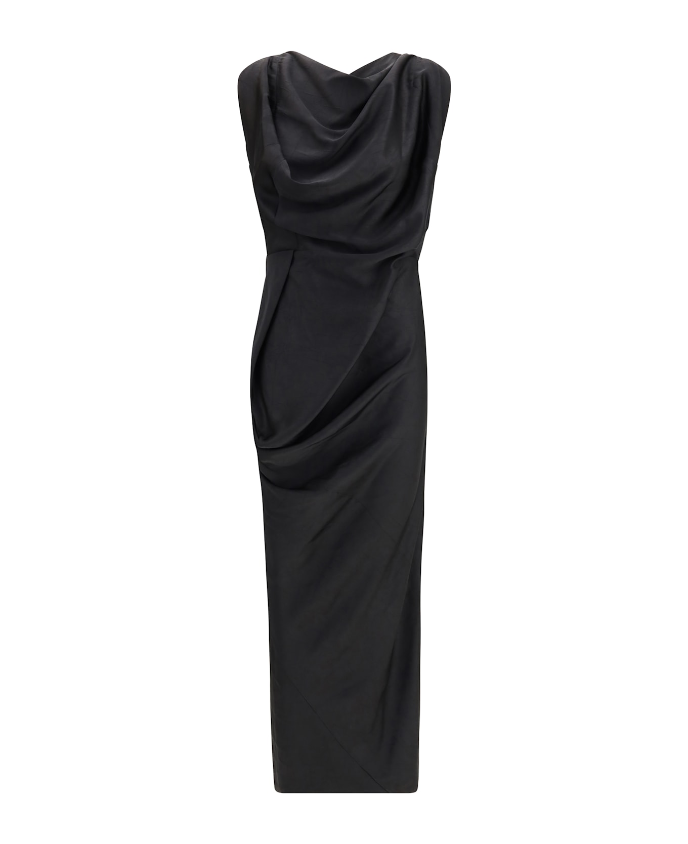 The long fond dress by vivienne westwood embodies the brand s signature sculptural elegance and effortless fluidity. crafted from lustrous satin, it wraps the bust and waist in refined draping that shapes a graceful column silhouette. the softly draped neckline and cinched waist highlight the feminine form, while the asymmetric hem and flowing gathers at the back create movement and depth. finished with a concealed side zip that preserves its clean, minimalist lines, this piece is a timeless expression of westwood s artistry where structure meets sensuality with impeccable finesse.
