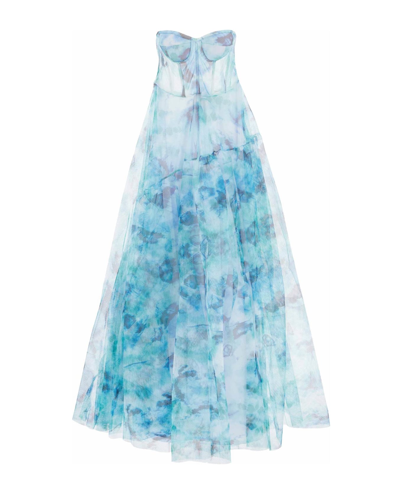 19:13 Dresscode long dress crafted in technical fabric mesh with tie-dye effect. Characterized by a semi-sheer bustier with molded cups, inner underwire and boned seams, this garment features a lined wide skirt with frilled construction and back invisible zipper and hook closure. The model is 177 cm tall and wears size IT 44.