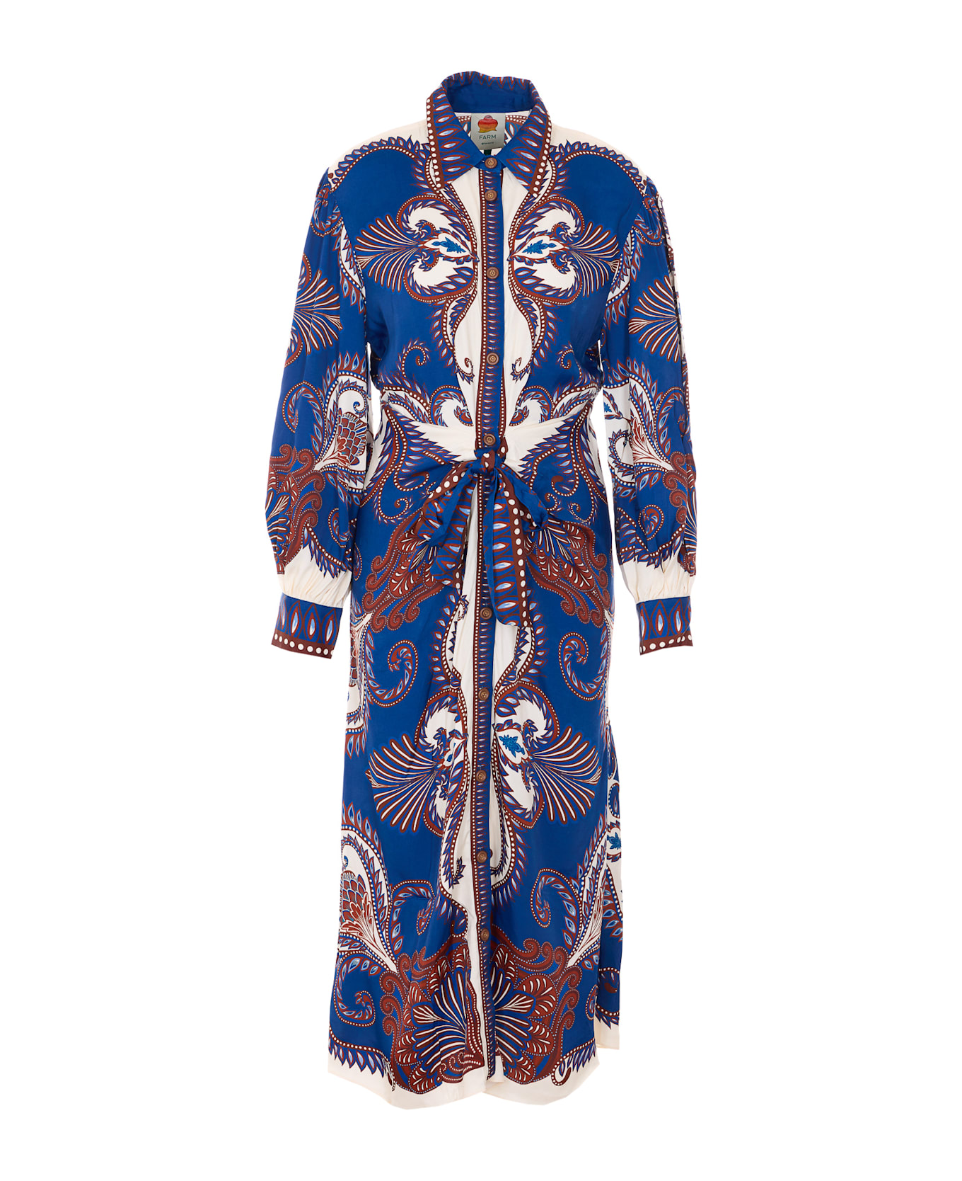 Farm Rio white and blue Arabesque scarf maxi dress, buttons closure, long sleeves, button on cuffs, paisley print, regular collar