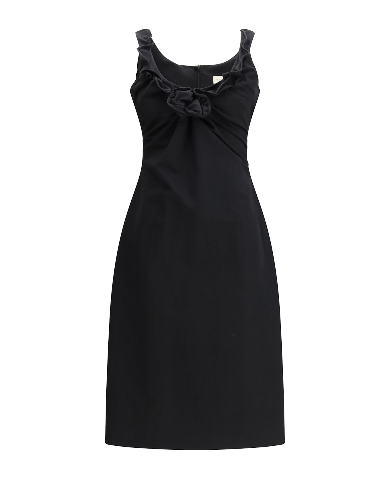 The sleeveless dress with a draped neckline by magda butrym conveys refined, tailored elegance, crafted from a soft cotton-blend fabric that offers both comfort and structure. the deep oval neckline is framed by delicate draping with a subtle ruffled trim that gathers at the bust, creating a graceful focal point. the silhouette is fitted through the waist, enhanced by shaping darts at the back and an interior lining for added support. it fastens at the center back with a concealed zipper and inner button, finished with a small vent that adds ease of movement and understated femininity.