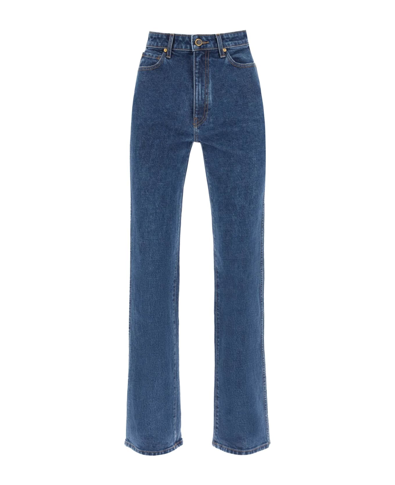 Khaite jeans crafted in pure cotton denim with medium wash. Five-pocket design featuring button fastening with zipper fly and belt loops characterized by a regular fit with high-rise waist and straight leg. The model is 177 cm tall and wears size 26.