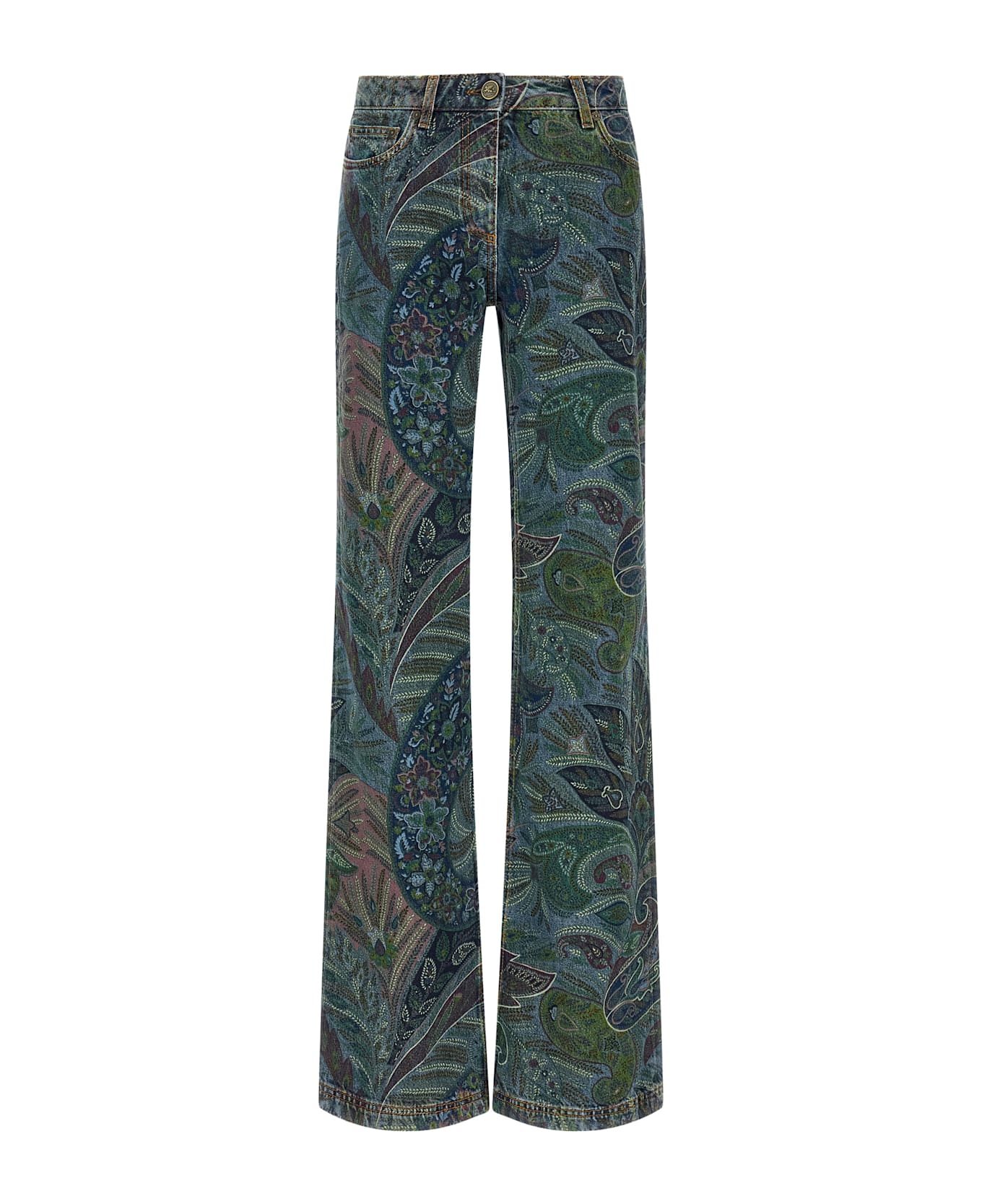 All-over floral print pure cotton denim jeans, contrast stitching, mid waist, flared leg, front zip and button closure, five pockets, leather logo tag with embossed logo on the back. Composition: 100% cotton