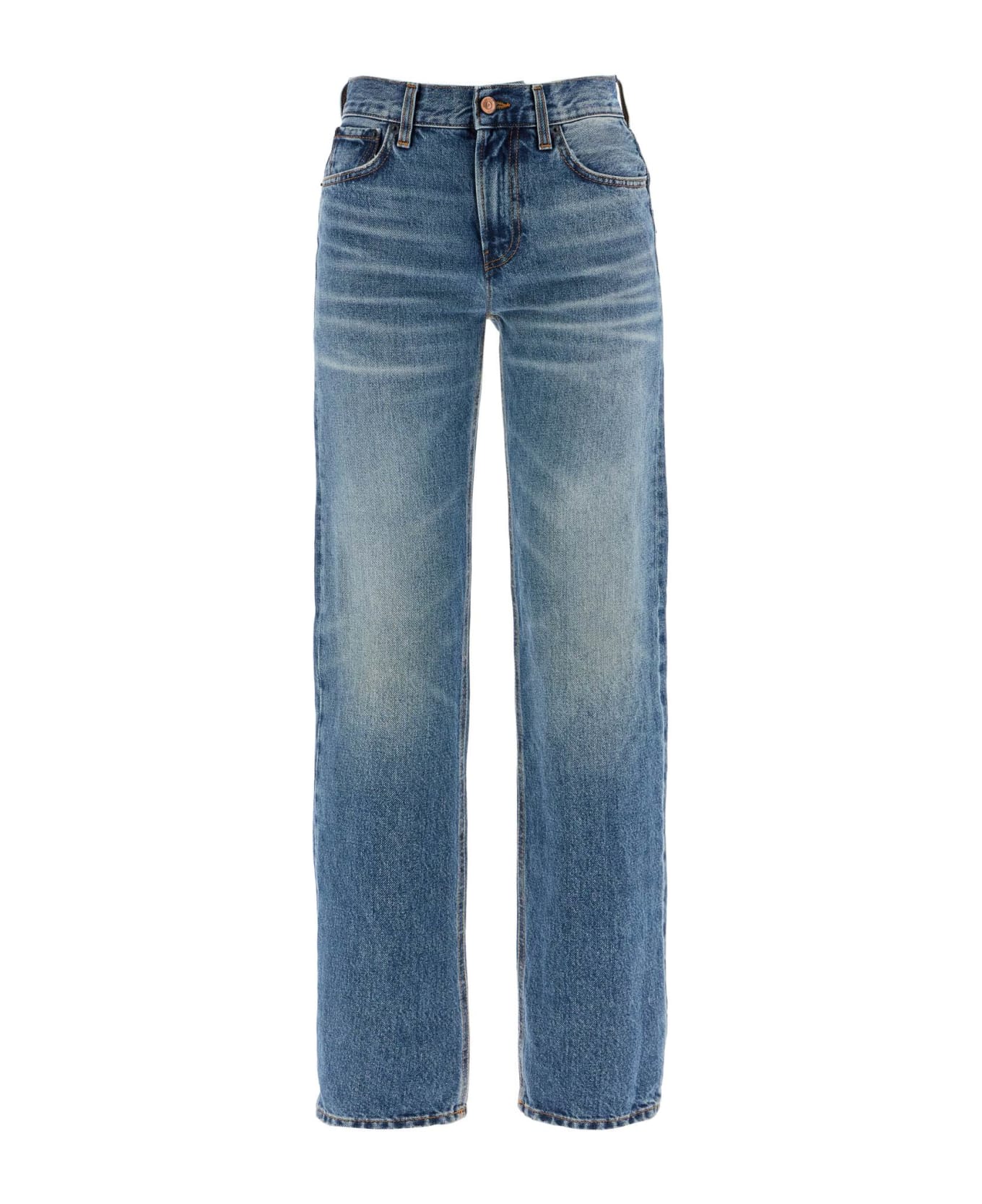The Cleo five-pocket jeans by Haikure are made of pure cotton denim with a stone-wash finish. They have a medium waist and a slightly fitted cut with a straight hem. The closure is with a button and hidden zip, and there is a logo jacron on the back. The model is 177 cm tall and wears size 26.