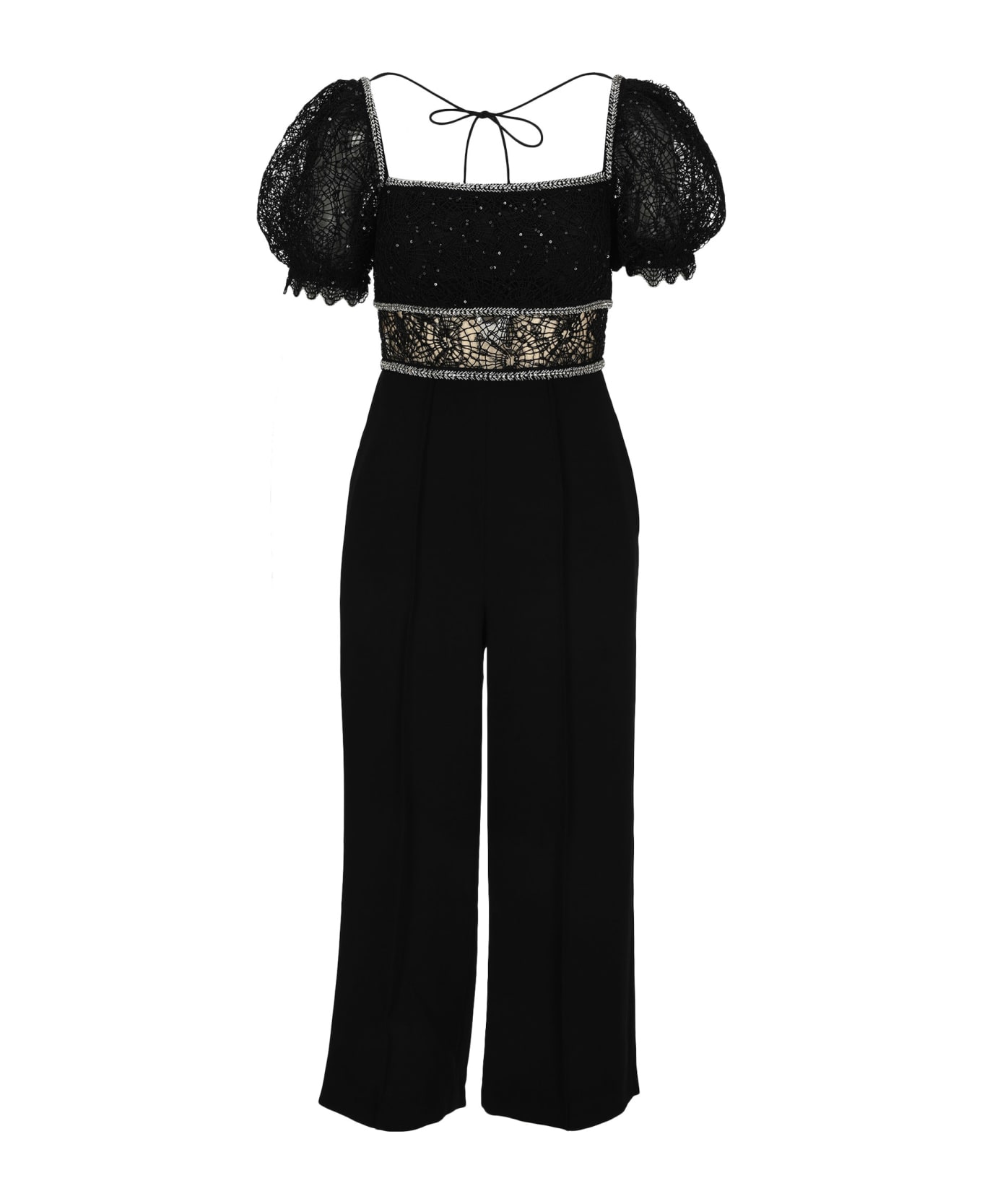 Black Sequin Circle Lace Jumpsuit By Self Portrait. Featuring: - Square Neck-line; - Short Puff Sleeves; - Lace Panels; - Rear Zip Fastening; - Side Slit Pockets; - Fitted Waist; - Cropped Length.