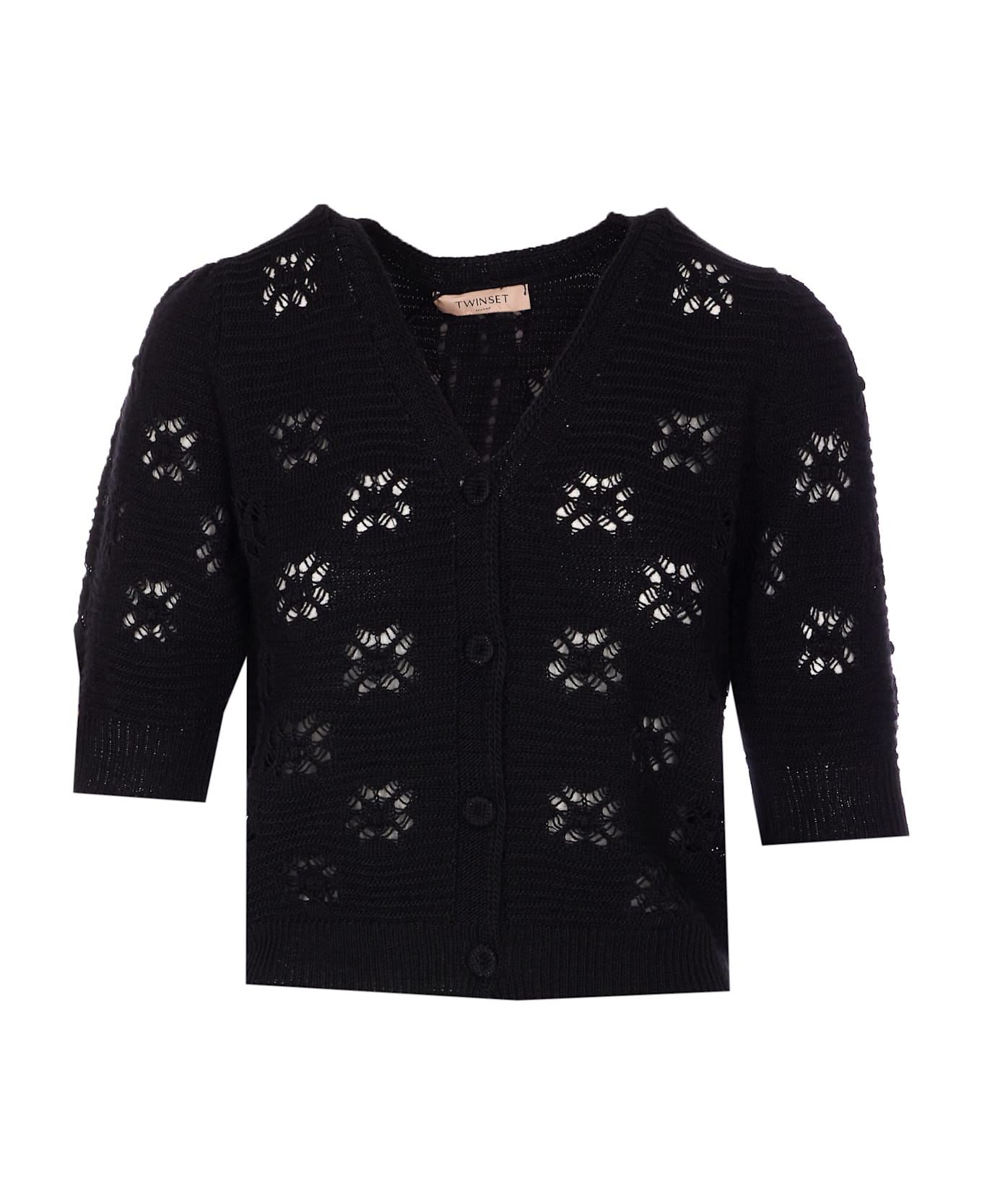 Twinset black cardigan, buttons closure, v neck, cropped, knitted, perforated details Composition: 50% Acrylic, 50% Wool