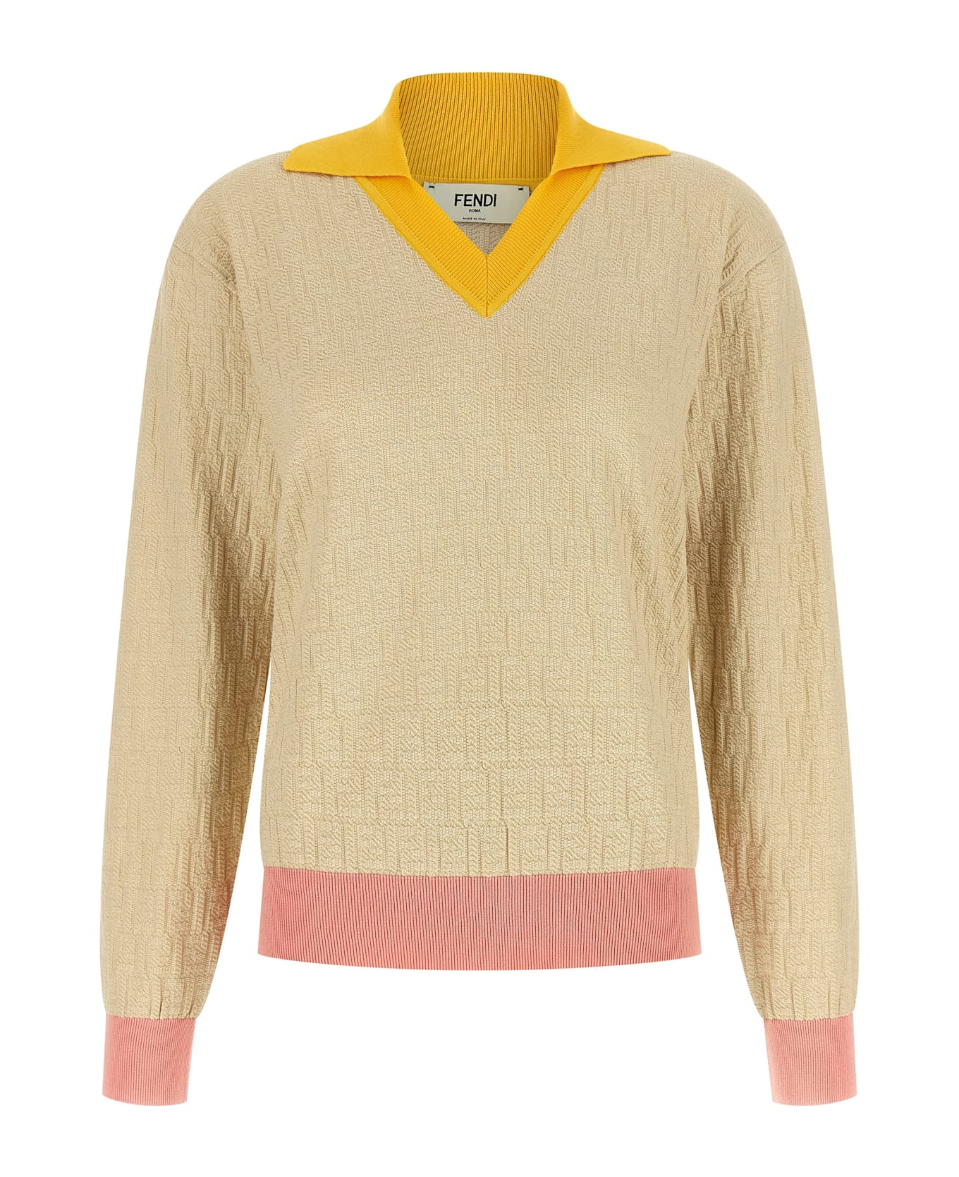Cotton and silk yarn sweater with iconic all-over jacquard FF pattern, contrast ribbed details, collar, V-neck, long cuffed sleeves, and headband. Composition: 100% cotton