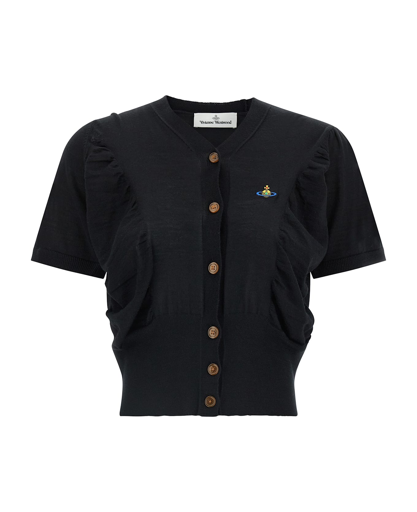 Pamela' wool and silk blend sweater with draped front side inserts, crop model, Orb logo embroidery and front button closure, V-neck, short cuffed sleeves, and band on the hem. Composition: 70% wool, 30% silk