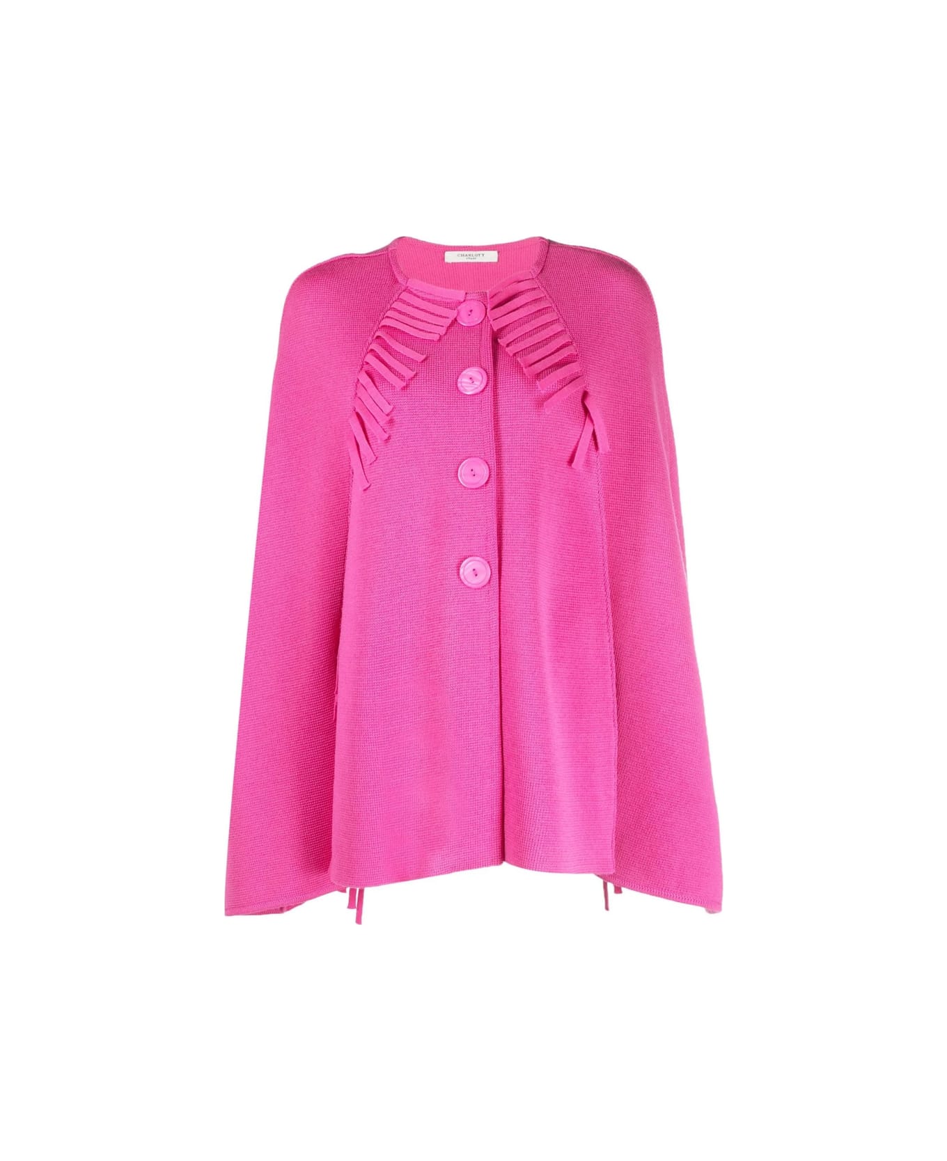 fuchsia pink wool fringe detailing round neck long sleeves front button placket