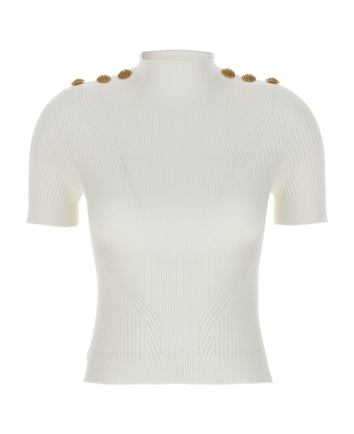 Viscose knit top, shaped at the waist with mock collar and short sleeves, gold logo buttons on the shoulders. Composition: 84% viscose 16% polyester