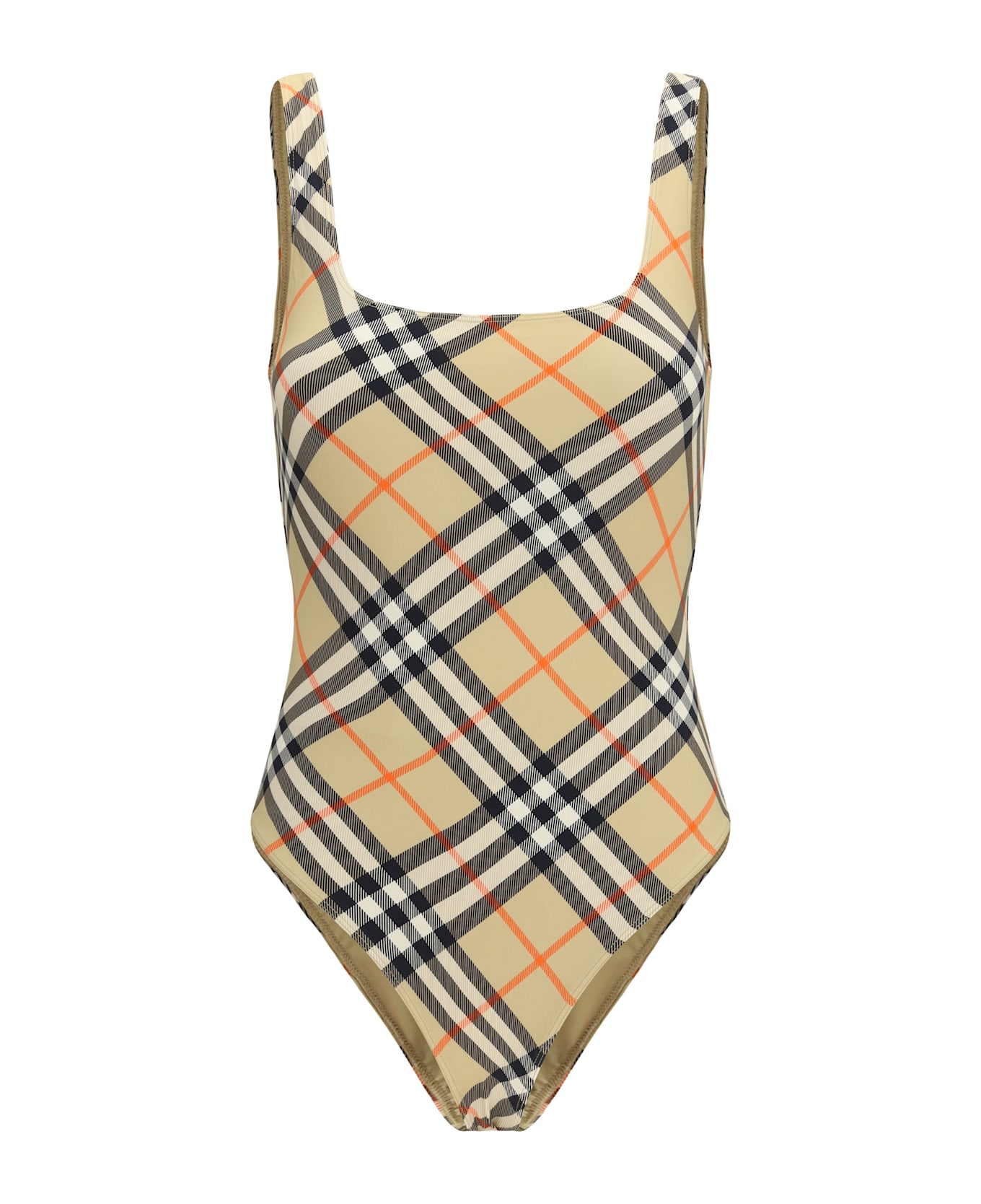 The check swimsuit by burberry stands out for an essential silhouette that interprets beachwear with contemporary elegance. the swimsuit model by burberry is crafted from stretch nylon and features a square neckline and scoop back that define the silhouette. the burberry check pattern enriches the design with an iconic and distinctive detail. the piece is completed with a matching drawstring bag for added practicality. the burberry swimsuit combines functionality and style in a refined design.