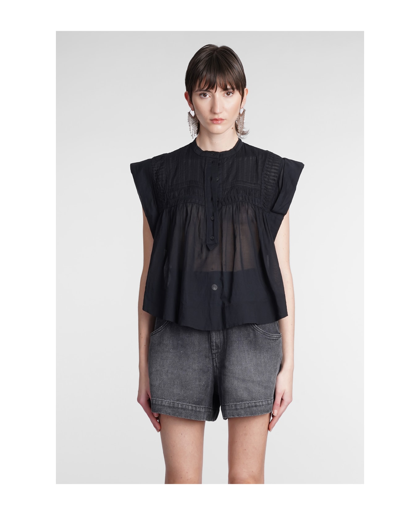 Leaza Topwear in black cotton, mao collar, ruffles, frontal buttoning, short sleeves, 100% cotton, Model is 180 cm and wears size 34