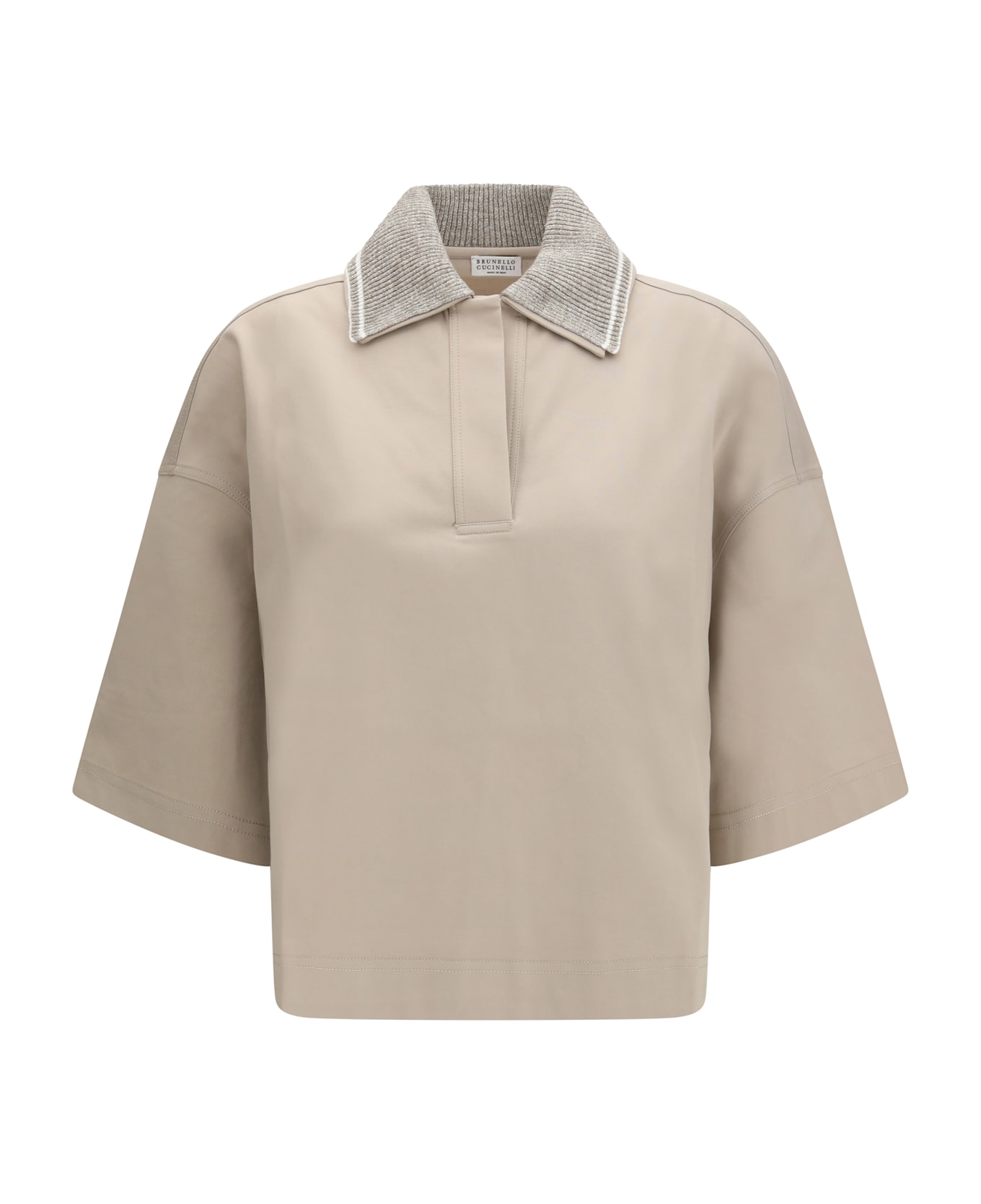 The interlock couture polo shirt by brunello cucinelli blends fine materials with a relaxed attitude, reflecting the travelwear line designed for leisure moments. crafted from cotton interlock couture with a compact, smooth and even surface, it balances informality and refinement while the stretch construction ensures comfort. the design features a v-neck, a sparkling knit collar insert enriched with lamé thread for subtle shimmering reflections, dropped shoulders, wide sleeves, and a cropped hem, creating a modern, effortless silhouette.