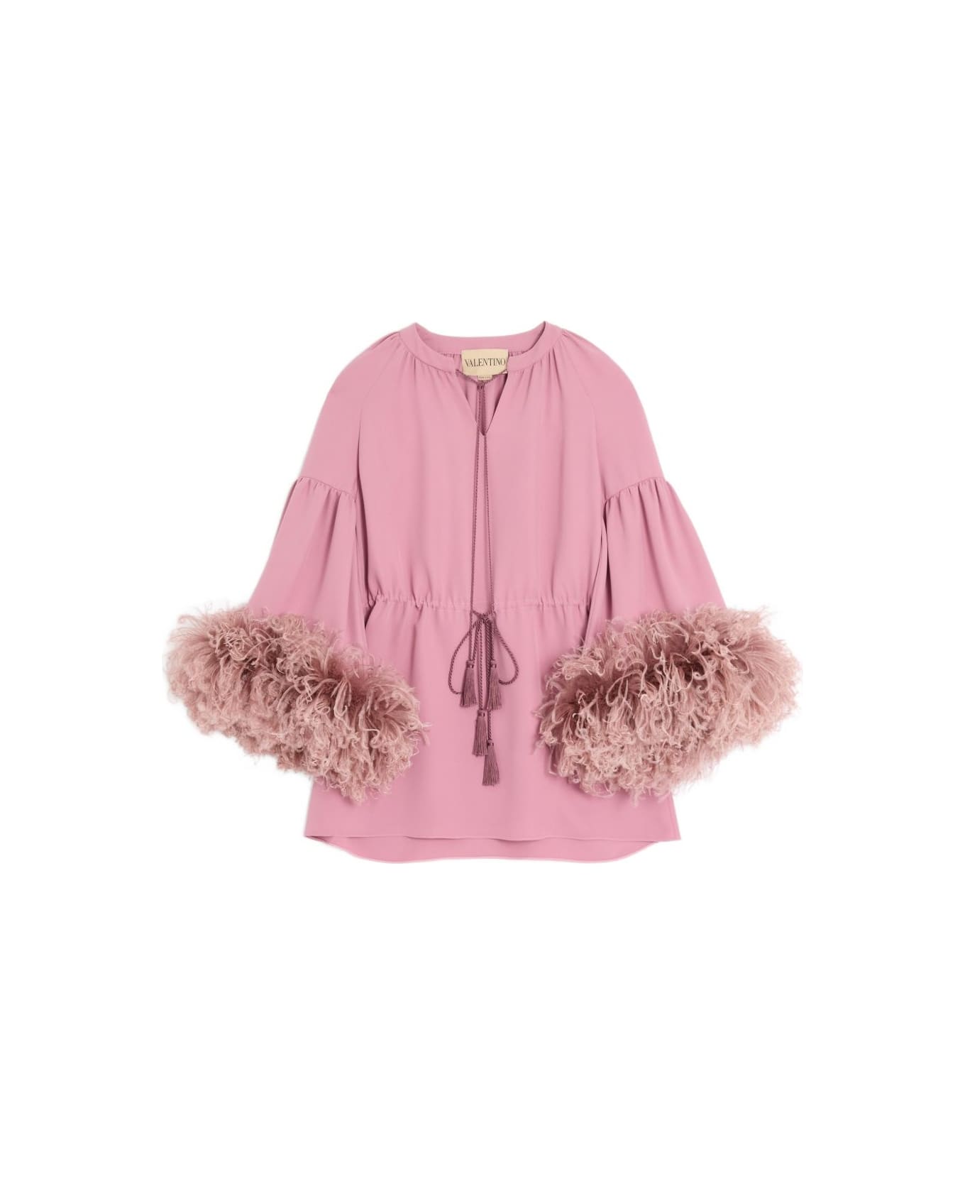 Valentino blouse light pink V-neck drawstring waist tassel detail long sleeves feather cuffs The full look includes Valentino Garavani accessories. Composition: Silk, 100%