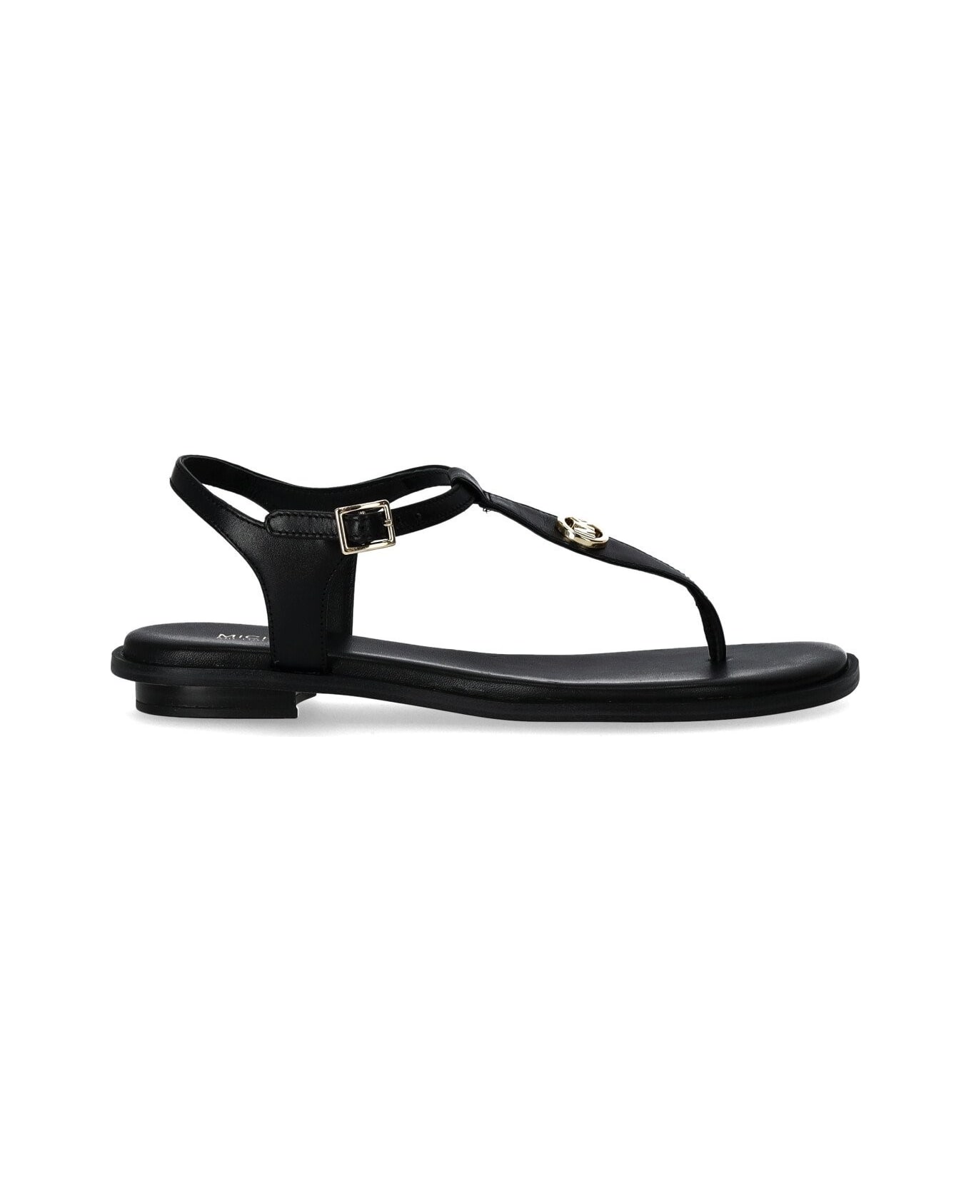 Michael Kors Mallory thong sandal made of black leather, characterized by golden metal details and MK logo applied on the front. Rubber sole, 1. 5 cm heel height.