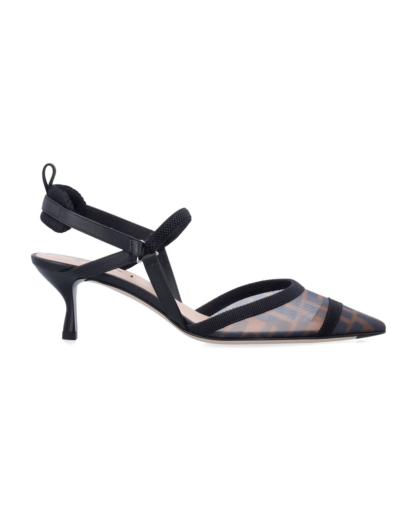 Streamlined And Feminine, The Colibrì Lite Slingbacks By Fendi Combine Technical Inspiration With Refined Elegance. Crafted From Mesh Featuring The Brown Ff Motif, They Are Designed With Slim Elasticated Ribbons That Wrap Gracefully Around The Foot. Black Leather Details And Ribbon Trims Define The Silhouette, While The Padded Cushion, Hiking-style Tab And Rubber Inserts On The Sole Add A Sporty Edge. The Look Is Completed By A Black Lacquered Mid-height Heel. Mesh Upper With Brown Ff Motif