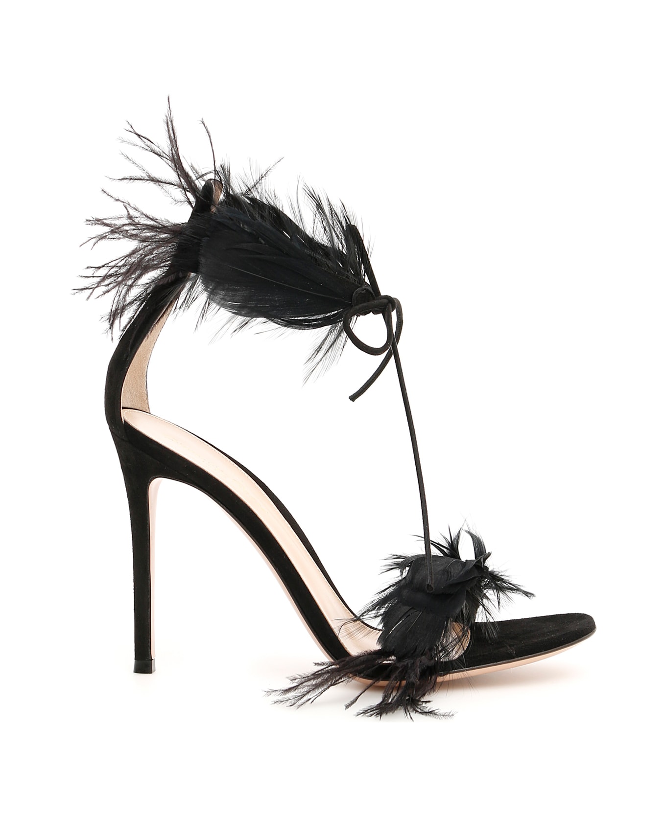 Gianvito Rossi suede sandals with decorative feathers and self-tie laces on the front. Leather lining, leather sole. Composition: 100% capra, 100% piume