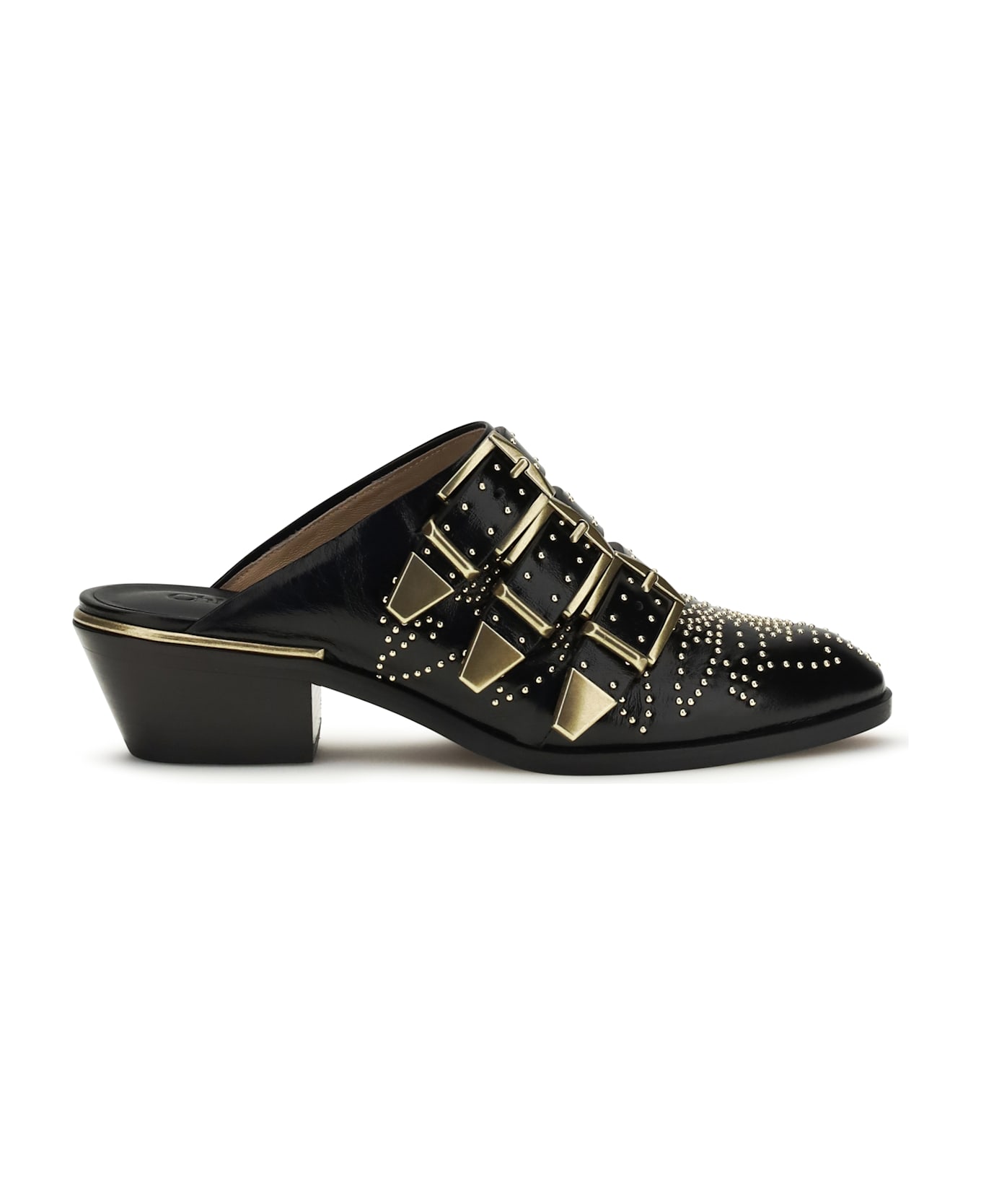 The susan leather mules by chloé are a style icon with a rock-chic and sophisticated appeal. crafted in soft leather, they feature a studded upper and a triple strap closure that adds character to the design, completed by a practical block heel. perfect for bold, contemporary looks.