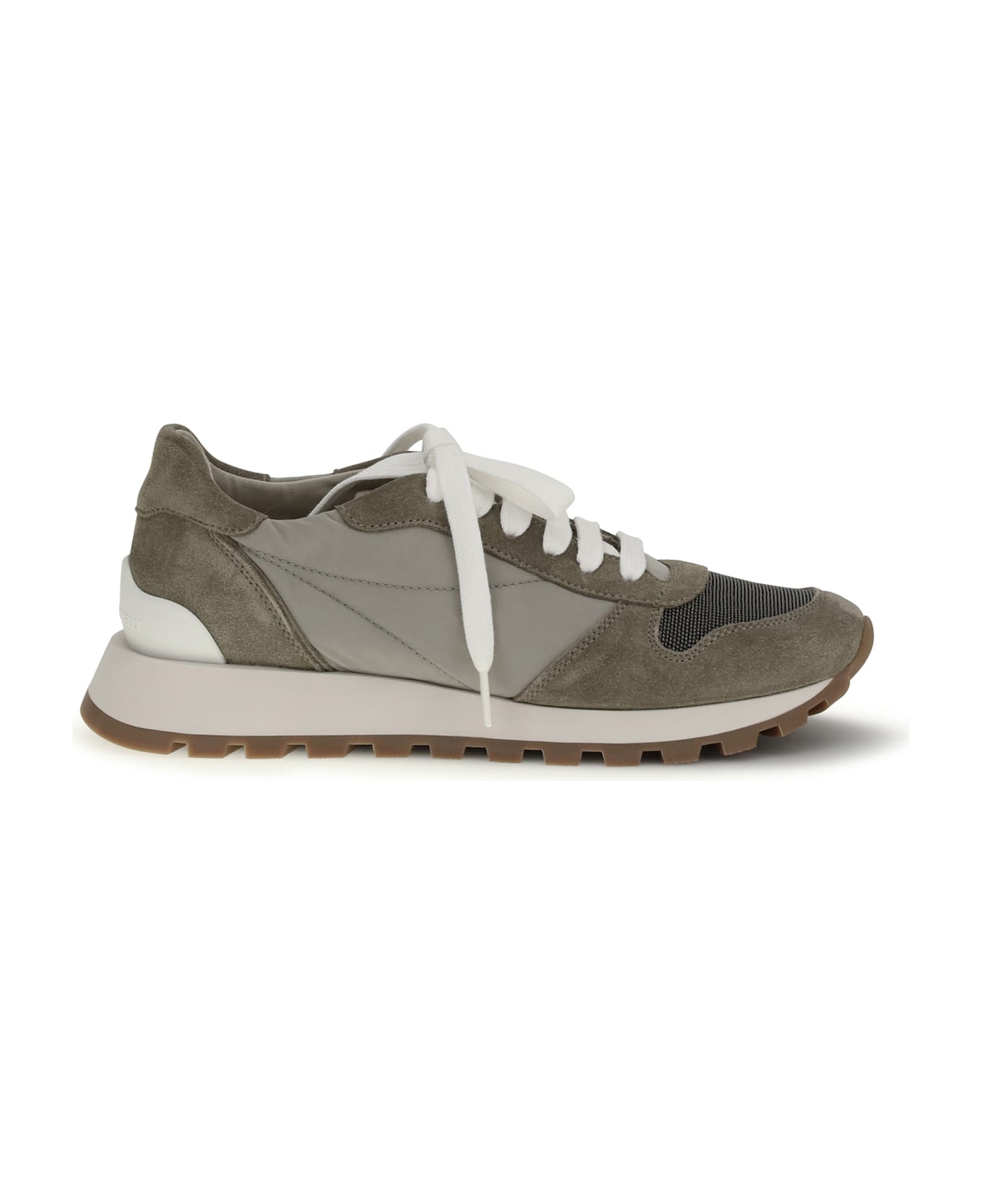 The runner sneakers by brunello cucinelli are a perfect example of contemporary style and understated sophistication. crafted from technical fabric, these sneakers feature refined details that enhance the minimalist elegance of the design. the iconic jewel applied to the upper is a distinctive element that catches the eye without being excessive, reflecting the brand's sophisticated aesthetic. the flat fabric lace closure adds a touch of practicality, while the fabric lining ensures comfort. the lightweight micro sole and tpu rubber tread guarantee durability and a stable walk. a perfect balance of luxury, comfort, and modern design.