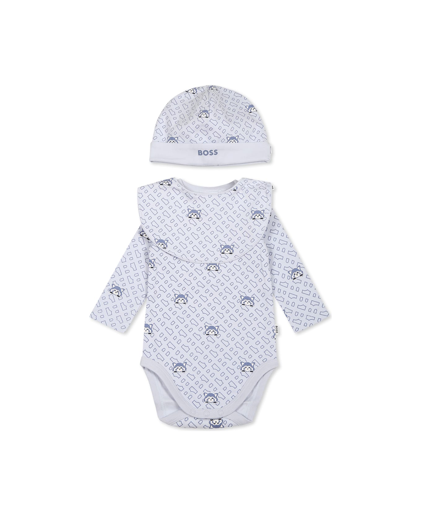 Light blue organic cotton body set, composed of a body, hat and bib. Long-sleeved body, with a crew neck, snap button closure on the shoulder and between the legs. It is embellished with all-over monogram and panda. Hat with a cuff, embellished with a monogram and an all-over panda. Bib with a side snap button closure, embellished with a monogram and an all-over panda.