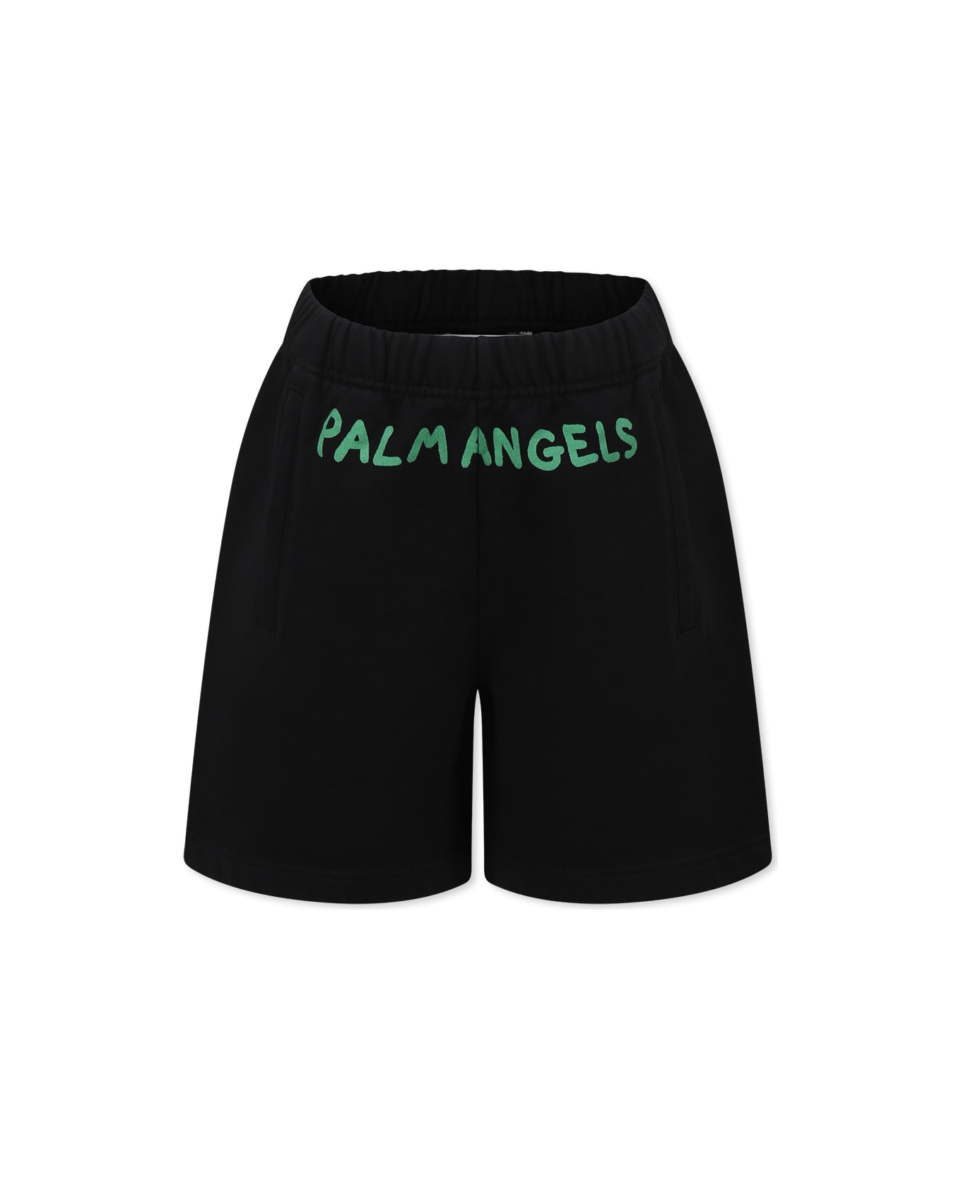 Black shorts in brushed cotton, with elasticated waist and side pockets. They are embellished with green logo on the front.