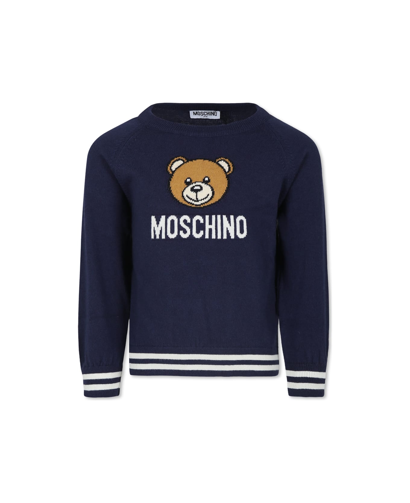 Blue sweater from the Moschino Kids brand, made of cotton blend. The long-sleeved model features a ribbed crew neck, cuffs and hem, stitching on the front and back. It is embellished with Teddy Bear and jacquard logo on the front.