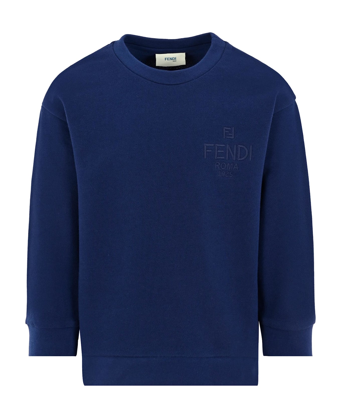 Blue sweatshirt from the luxury brand Fendi Kids, made of slightly fleeced cotton, with long sleeves, a crew neck, cuffs and a ribbed hem. It is embellished with the Fendi Roma 1925 logo, to celebrate the brand's 100th anniversary, embroidered on the chest;