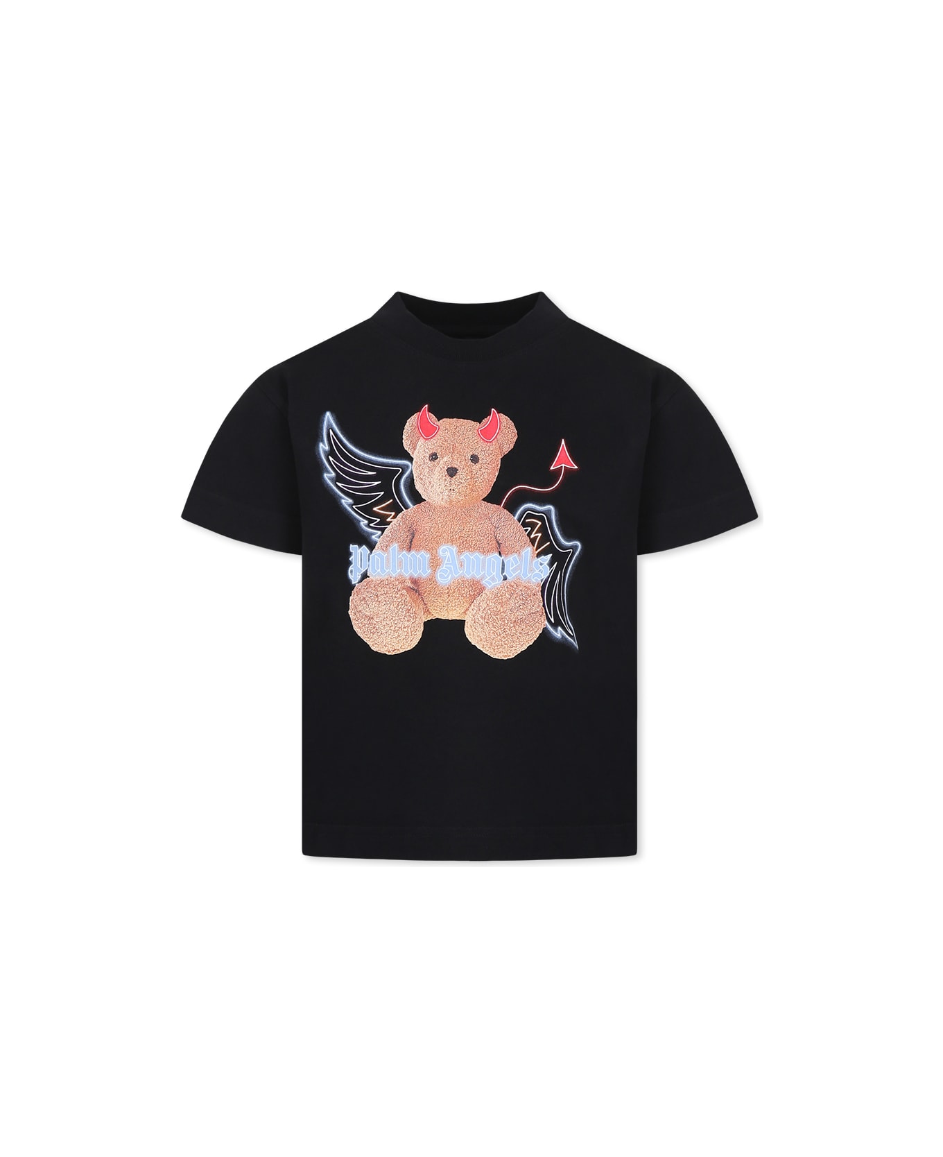 Black cotton t-shirt, with short sleeves and ribbed crew neck. It is embellished with iconic bear with wings and logo on the front.