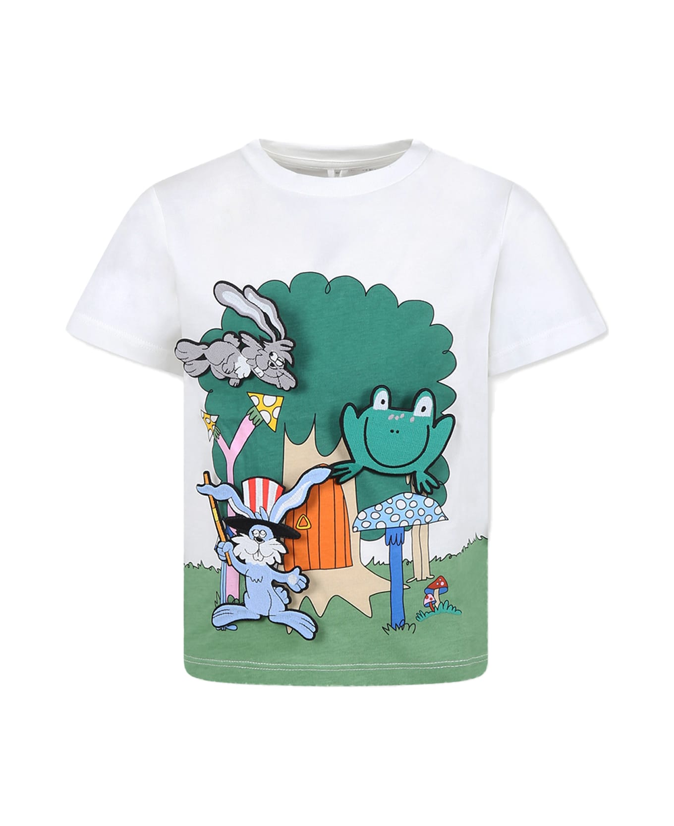 White GOTS certified organic cotton t-shirt, short sleeves, with ribbed crew neck, side pocket and detachable patch, in the shape of a rabbit and a frog. It is embellished with forest print on the front.