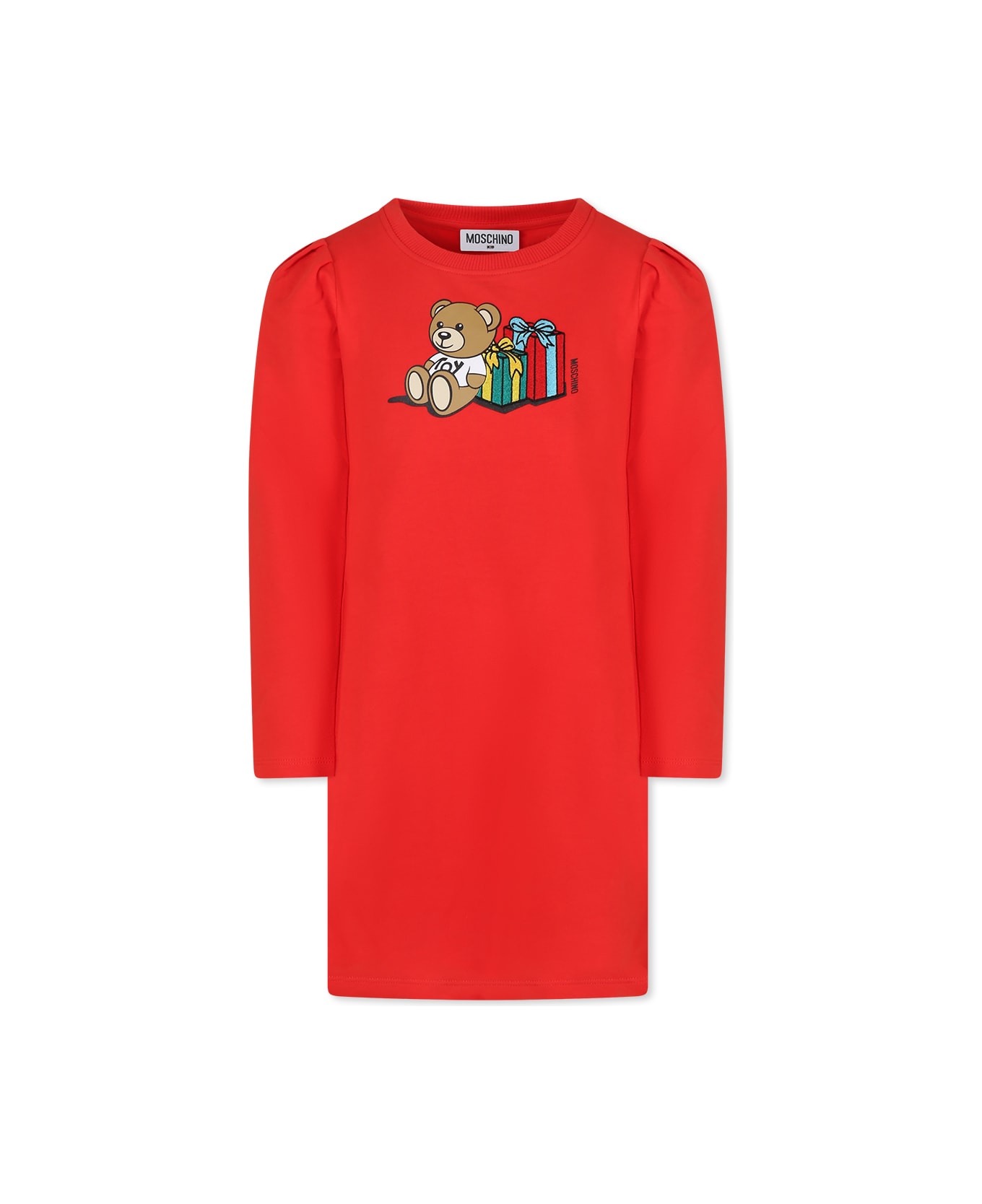 Red dress from the Moschino Kids brand, in fleece cotton, with long sleeves, a crew neck and ribbed cuffs. It is embellished with two printed Teddy Bears and embroidered gifts on the front.