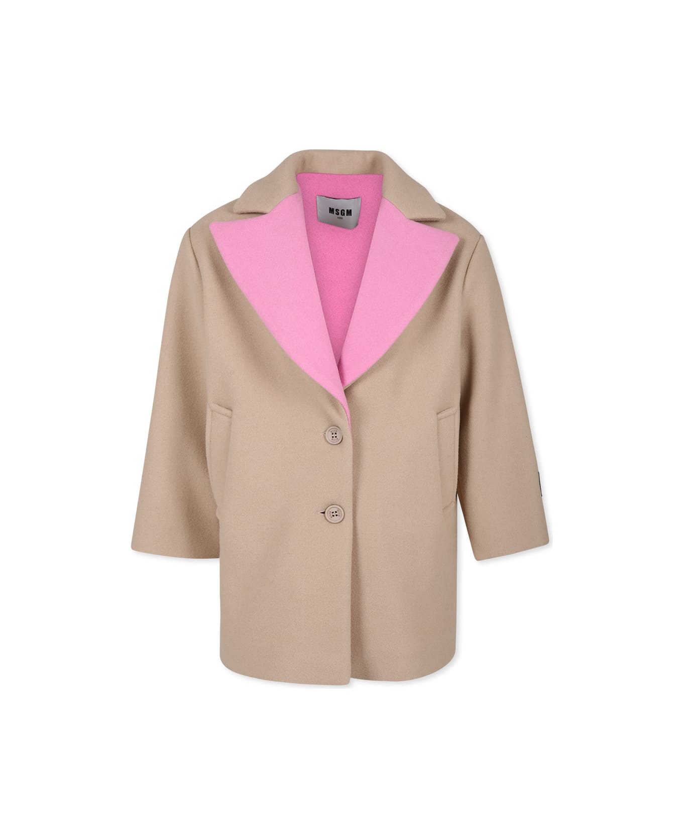 Beige cloth coat, long sleeves, with pink lapel collar, front button closure, side pockets and vent on the back. It is embellished with a logo patch on the sleeve.