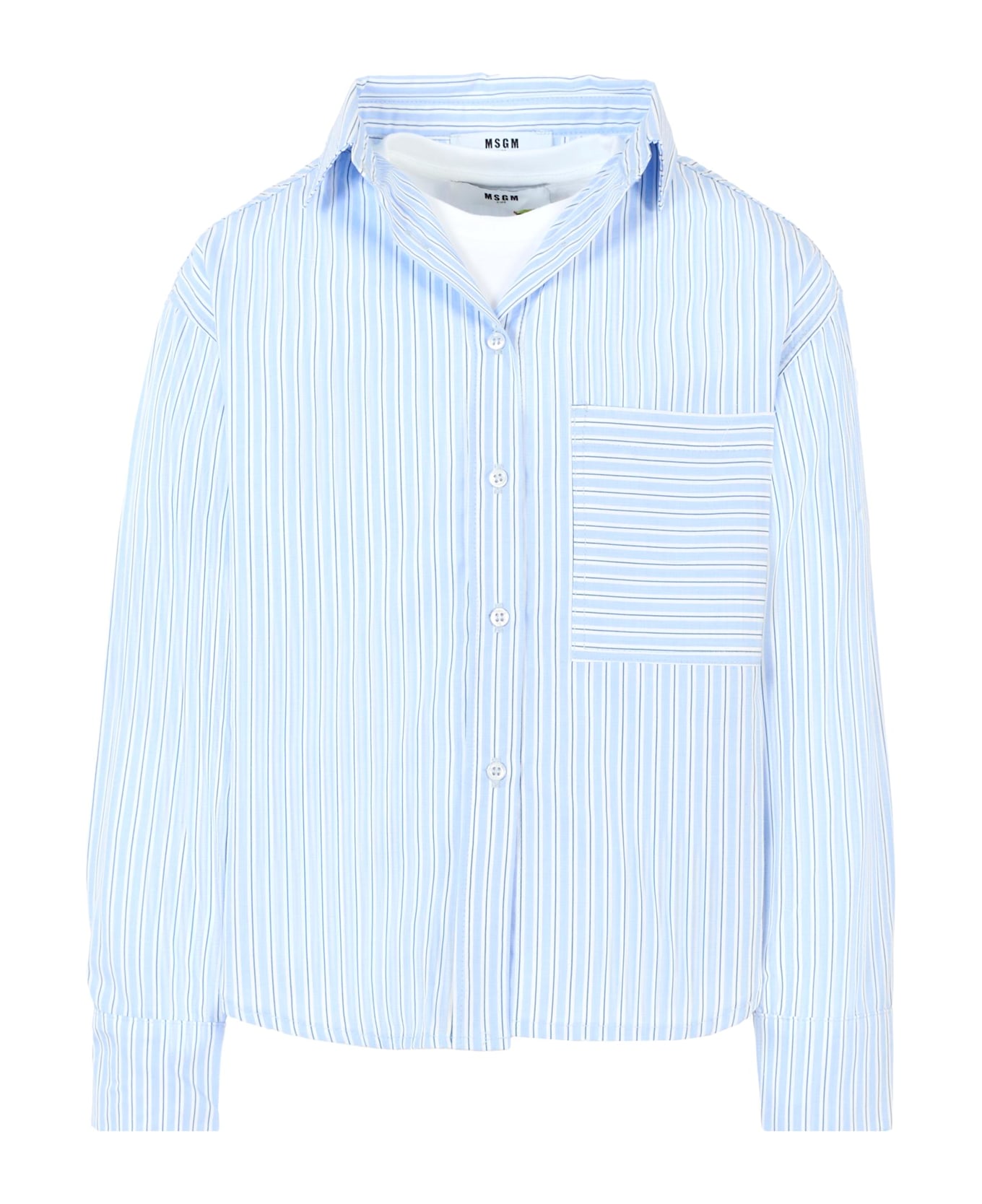 Light blue and white striped shirt with long sleeves, classic collar, button fastening on the front and cuffs, breast pocket, and white inner t-shirt. It is embellished with a red logo on the front of the T-shirt and black lettering on the back.