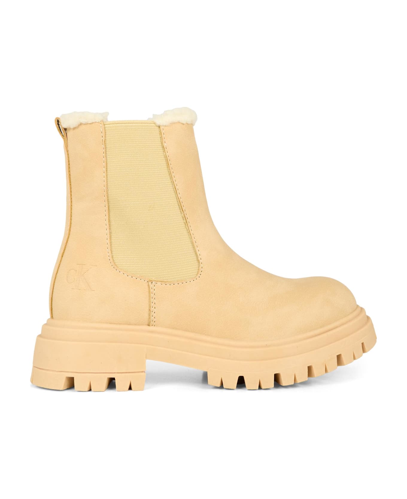 Beige ankle boots with rubber soles, side zip fastening, faux shearling detail on the upper, elasticated sides, and a round toe. They are embellished with an engraved logo on one side.