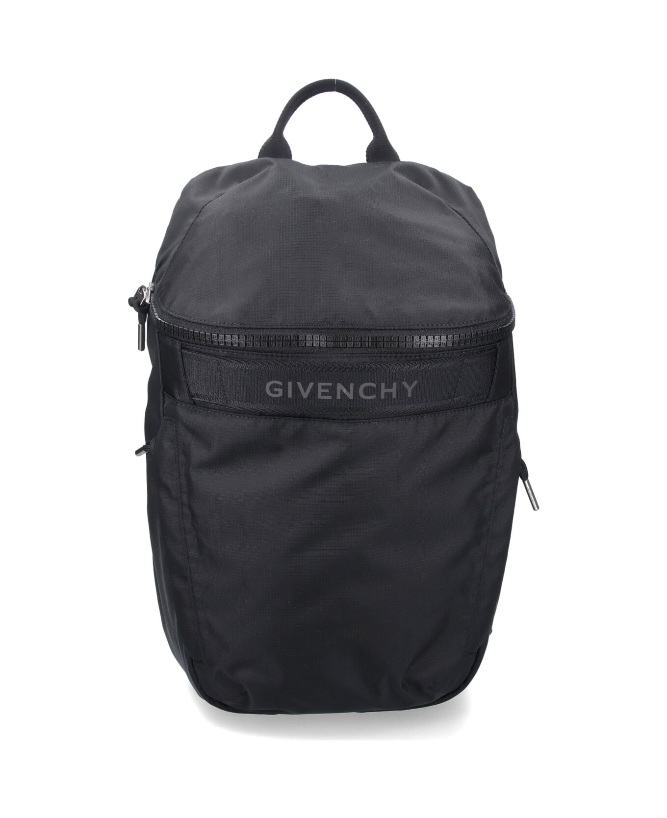Givenchy "G-Treck" black nylon backpack with a main flap, zip closure, top handle, tone-on-tone logo print, two side zip pockets, adjustable shoulder straps with reflective logo on the back.