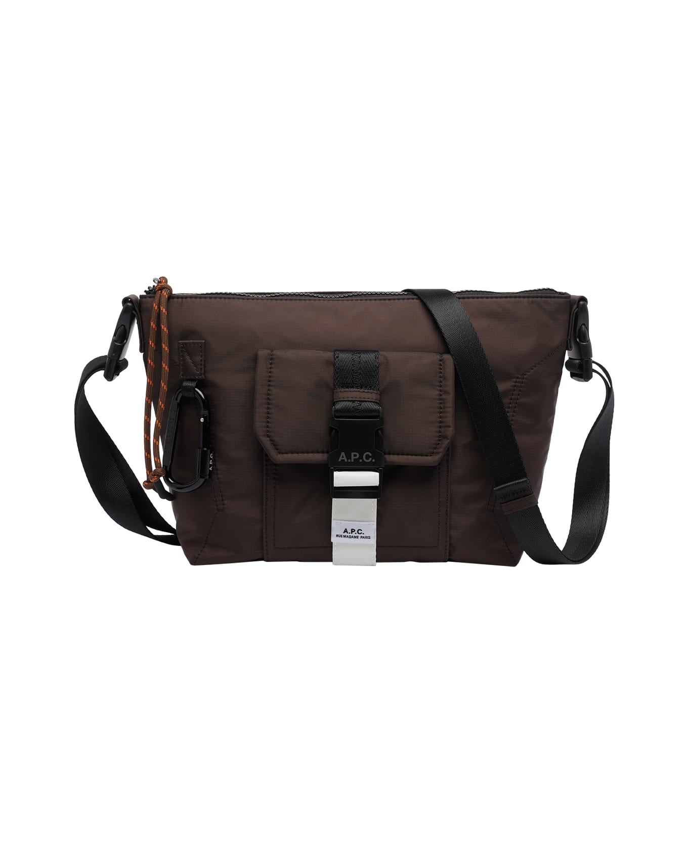 A. P. C. brown Trek satchel bag, zip closure, inner open pocket, zipped pocket, external buckle closure, removable strap, carabiner detail Composition: 100% Polyamide