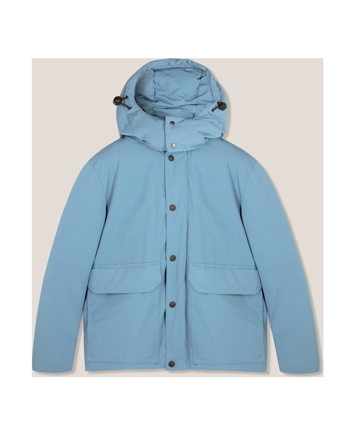 This light blue down jacket is ideal even on the coldest days. The patch pockets with flap, zip and snap fasteners make this item comfortable and versatile.