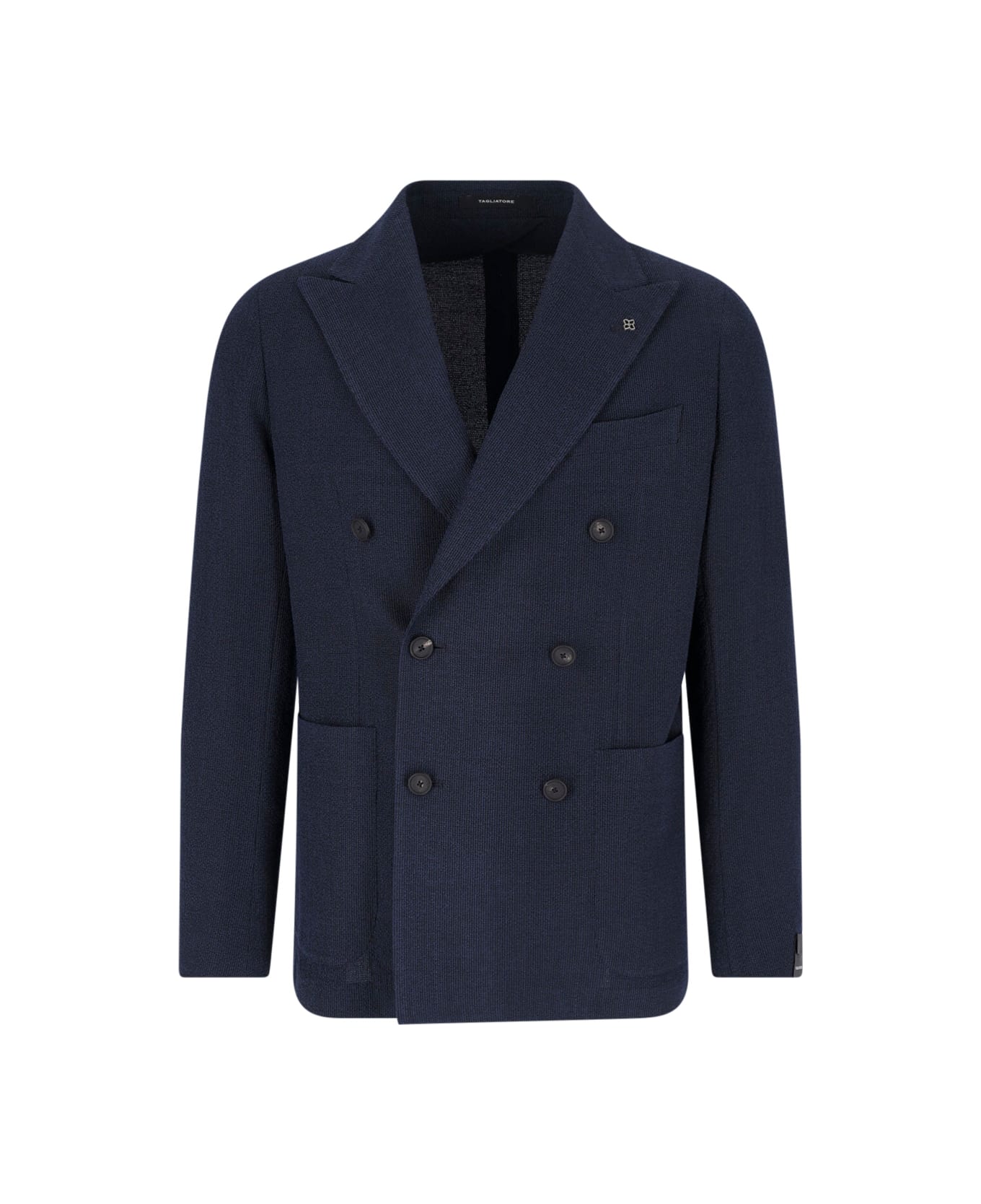 Tagliatore double-breasted blazer jacket made exclusively for Sugar in navy blue virgin wool blend with peak lapels, silver metal logo charm detail, button closure, chest pocket, two side flat pockets, button cuffs, straight hem.