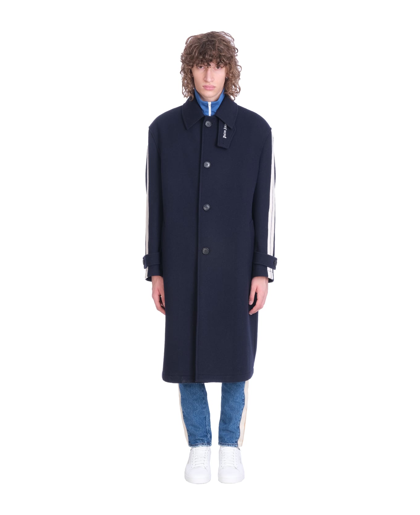 Coat in blue wool, collar, side bands, frontal buttoning, edges sleeves, back slip, 50% wool, 25% acrylic, 25% Polyester, Made in Italy, Model is 190 cm and wears size 48 Composition: Wool