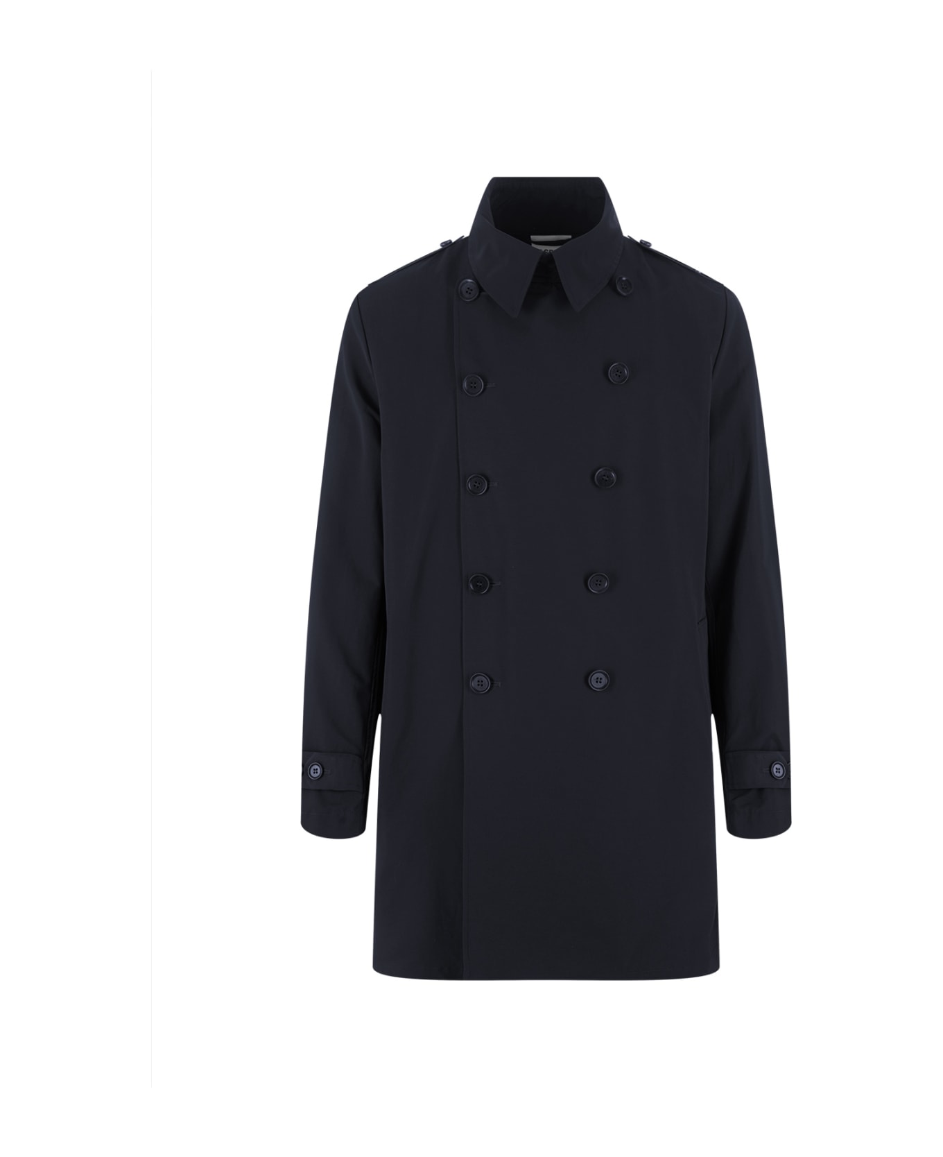 Men's double-breasted trench coat by Aspesi made of navy blue cotton-blend gabardine and featuring a classic collar, a button fastening, long sleeves, cuffs with a strap, two side pockets and a central back vent.