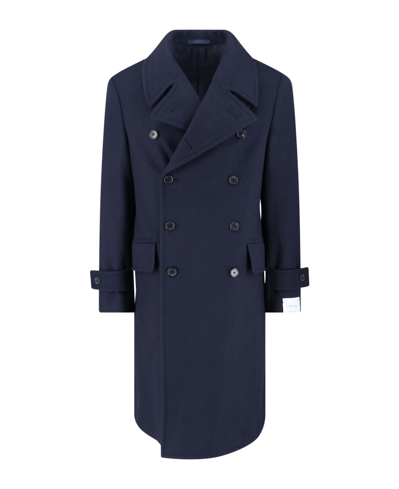 Caruso double-breasted navy blue wool coat with peak lapels, button closure, two side pockets, button cuffs, contrast logo patch on the cuff, maxi back split, straight hem. Composition: 100% Wool