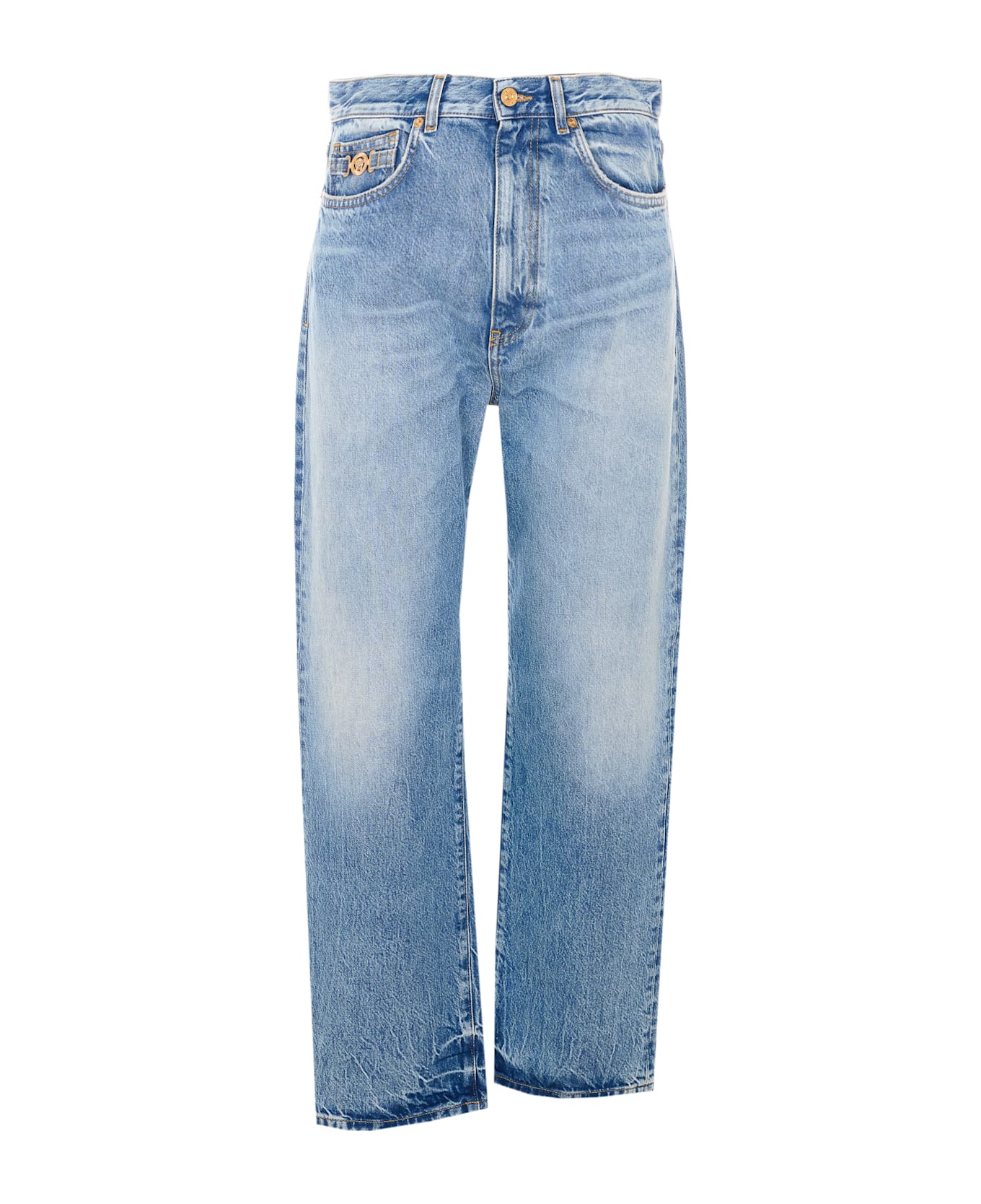 Versace light blue denim pants, button and zip closure, 5 pockets, Medusa button logo on the front, patch logo on the back, regular fit Composition: 100% Cotton
